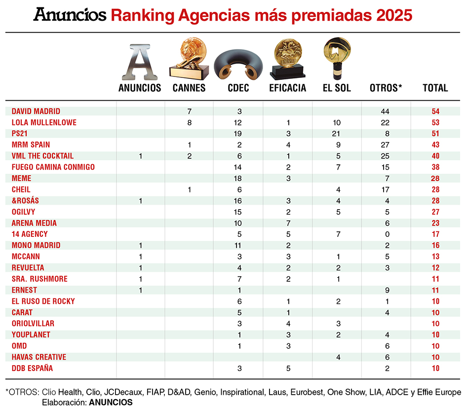 Si la entrada de PS21 en el trío de cabeza es una de las grandes novedades que depara el ranking de agencias más premiadas elaborado por Anuncios y correspondiente a 2025, el otro dato interesante es la aproximación de los resultados, especialmente en las tres primeras posiciones del mismo. Un aspecto que contrasta con los resultados de años anteriores, en los que David, que sigue a la cabeza en 2025, dominaba de manera destacada y a gran distancia del resto. Una distancia que, como se recordará, se acortó en el ranking de 2024, con Ogilvy ascendiendo a la segunda posición, a poco más de 20 puntos de distancia, pero que se ha pulverizado en la clasificación correspondiente al último ejercicio en la que tres agencias: David, Lola y PS21, por este orden, muestran una ‘apretada’ competencia, con un resultado de 54, 53 y 51 puntos computados, respectivamente.