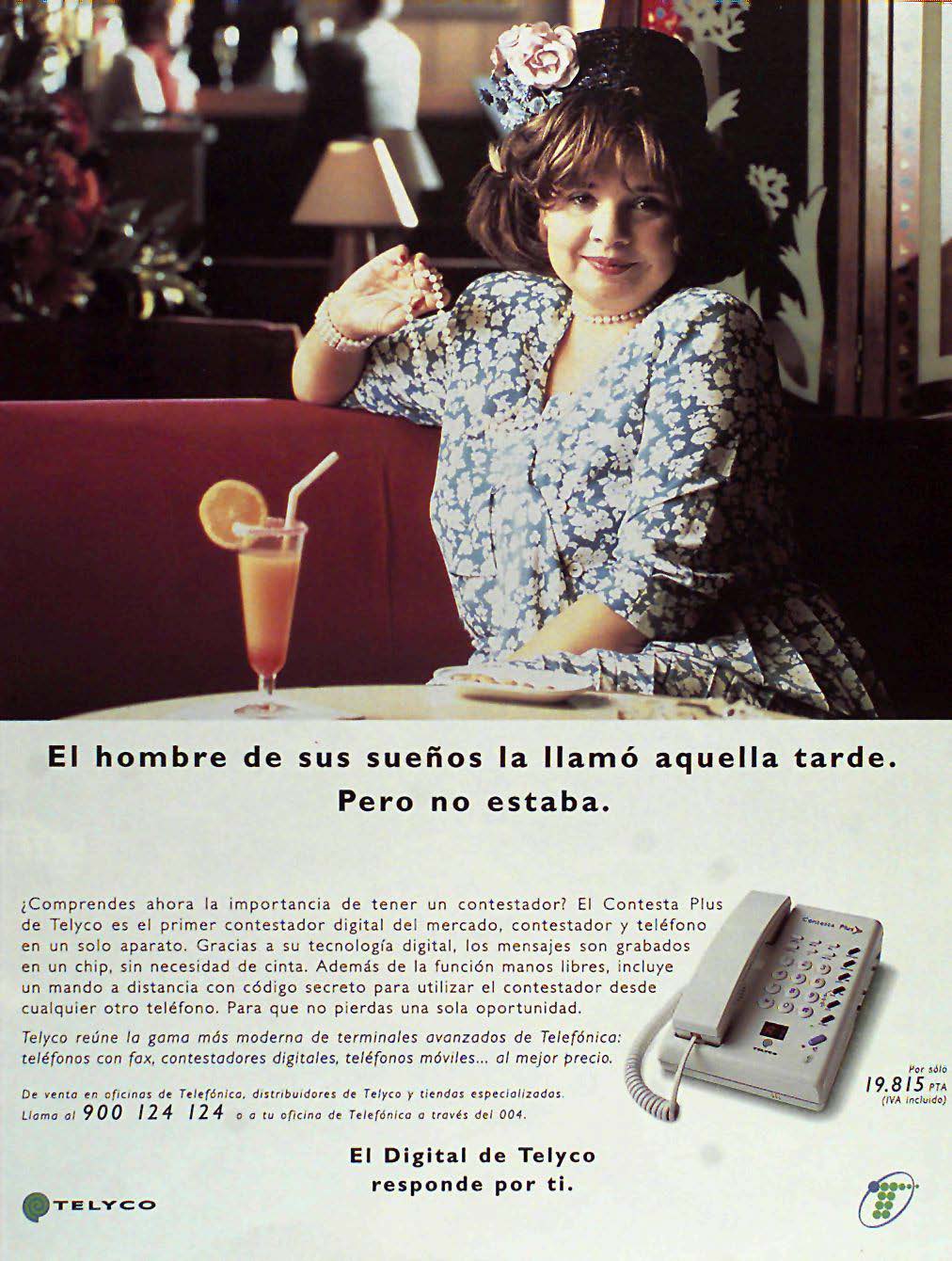 La evolución de las comunicaciones se ve reflejada en los anuncios de la época: no había móviles todavía, pero sí buscas (abreviatura de buscapersonas, pero también se popularizaron como beepers), que podían mostrar textos en su pequeña pantalla. La ventaja de este sistema era la gran cobertura y el precio moderado. Telefónica los comercializaba bajo la marca de Mensatel y fueron protagonistas incluso de alguna campaña navideña.