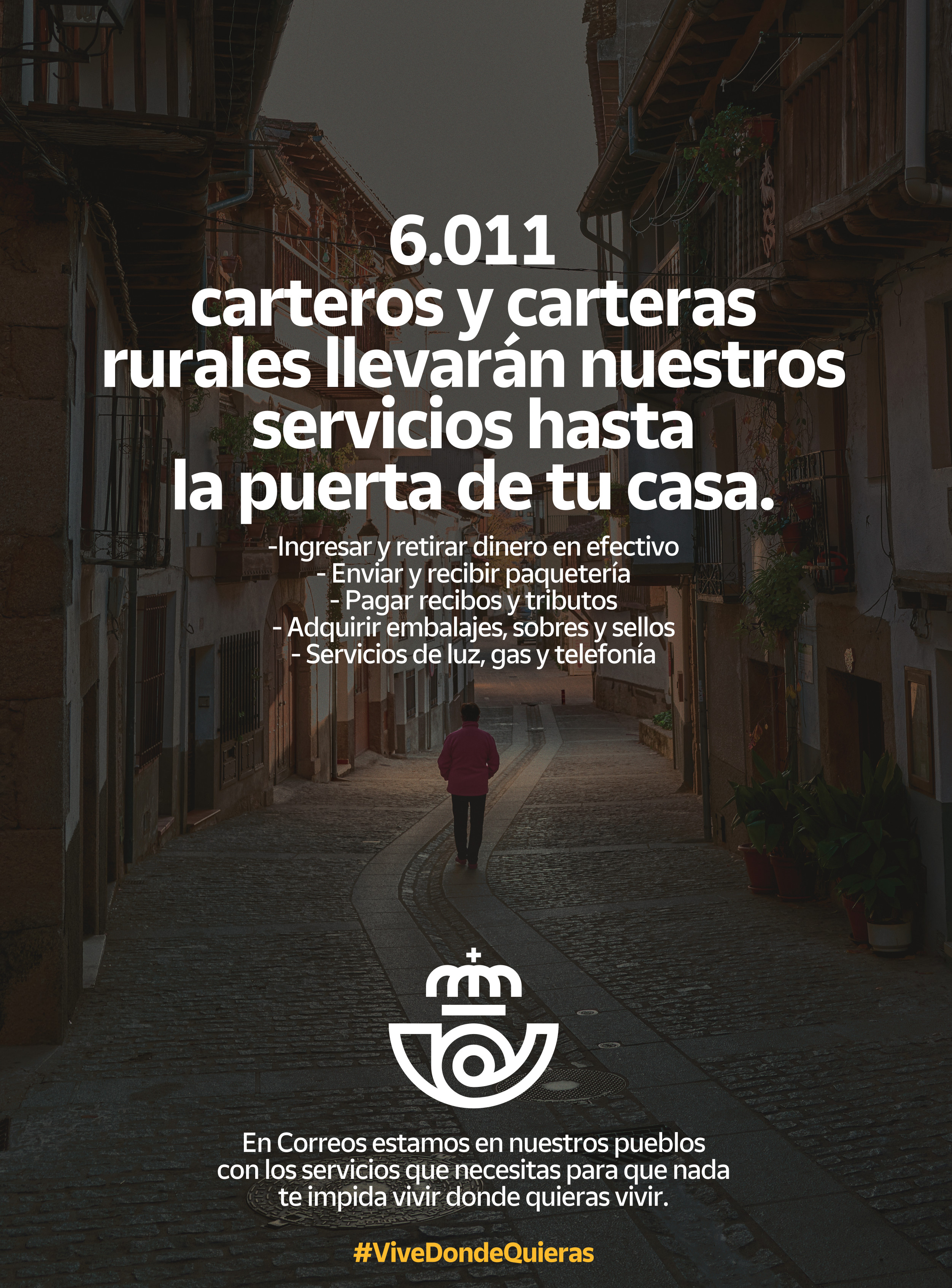Por ejemplo, con servicios como ingresar y retirar dinero en efectivo, enviar y recibir paquetería, pagar recibos y tributos, adquirir embalajes, sobres y sellos, gestionar servicios de luz, gas y telefonía, entre otros muchos que la compañía ya ofrece en el entorno rural, gracias a la digitalización y los dispositivos electrónicos portátiles (PDAs) con que cuenta el personal de reparto, lo que permite acceder a ellos a la puerta de la propia casa y en un contexto de despoblación. O de repoblación, según se mire, porque, señalan desde Correos, “a raíz del impulso del teletrabajo cada vez son más las personas que han decidido o están pensando cambiar su lugar de residencia de una ciudad a un pueblo”. Y a ellos se dirige, principalmente, la nueva campaña.