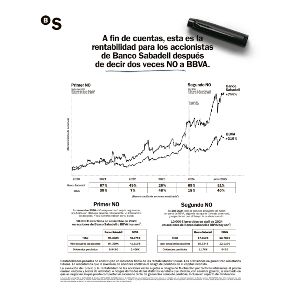 En un momento en el que la opa presentada en mayo de 2024 por BBVA sobre Banco Sabadell entra en su recta definitiva, la batalla publicitaria establecida alrededor de esta operación por parte de las dos entidades suma un nuevo capítulo.