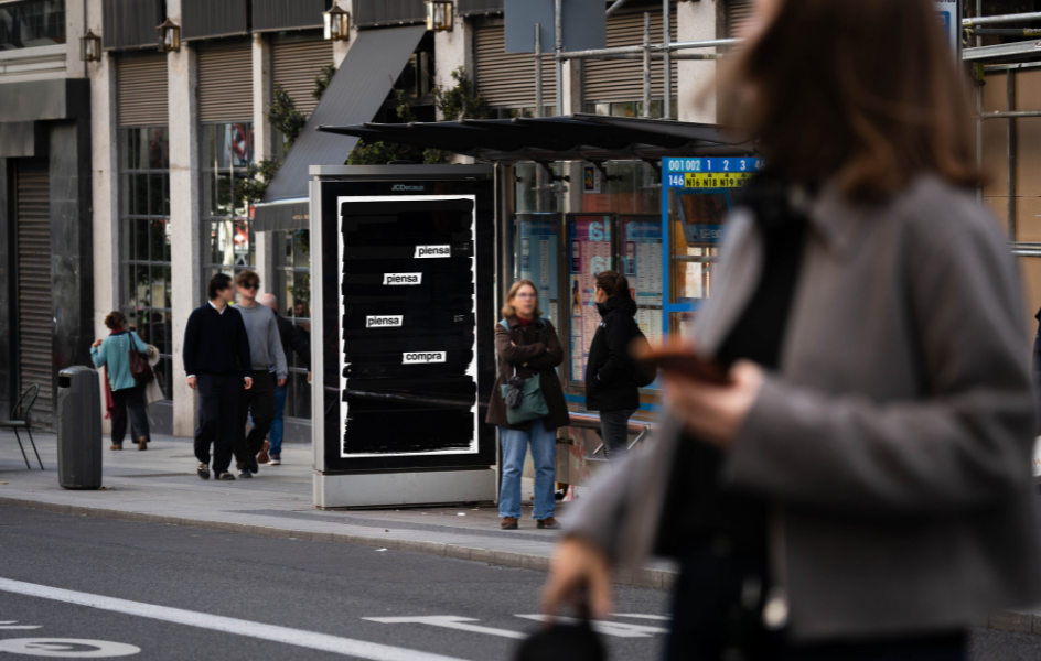 Lejos de eliminar la publicidad, Block Friday propone bloquearla temporalmente para generar un “silencio visual” en soportes estratégicos de la ciudad de Madrid. Desde pantallas digitales en Callao y mupis en la Gran Vía y la calle Fuencarral, hasta lonas de gran formato en la Ronda de Atocha y espacios del metro madrileño, todos estos soportes han sido personalizados con un diseño sobrio y monocromático protagonizado por frases que destaca sobre un fondo oscuro. Por ejemplo, “Piensa, piensa, piensa, compra".