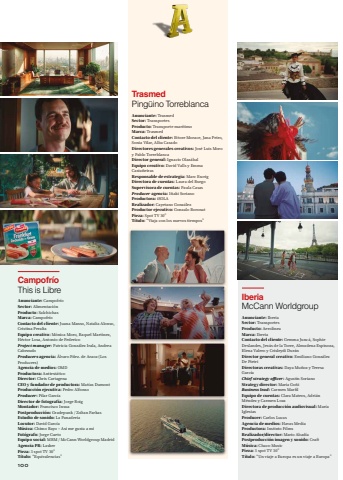 CampofríoThis is LibreAnunciante: CampofríoSector: AlimentaciónProducto: SalchichasMarca: CampofríoContacto del cliente: Juana Manso, Natalia Alonso, Cristina PeraltaEquipo creativo: Mónica Moro, Raquel Martínez, Héctor Losa, Antonio de FedericoProject manager: Patricia González Irala, Andrea CabezudoProducers agencia: Álvaro Fdez. de Araoz (Los Producers)Agencia de medios: OMDProductora: AntiestáticoDirector: Chris CartagenaCEO y fundador de productora: Matías DumontProducción ejecutiva: Pedro AlfonsoProducer: Pilar GarcíaDirector de fotografía: Jorge RoigMontador: Francisco InsuaPostproducción: Gradepunk / Zoltan FarkasEstudio de sonido: La PanaderíaLocutor: David GarcíaMúsica: Chimo Bayo – Así me gusta a míFotógrafo: Jorge CuetoEquipo social: MRM / McCann Worldgroup MadridAgencia PR: LaskerPieza: 3 spot TV 30”Título: “Equivalencias”TrasmedPingüino TorreblancaAnunciante: TrasmedSector: TransportesProducto: Transporte marítimoMarca: TrasmedContacto del cliente: Ettore Morace, Jana Peiro, Sonia Vilar, Alba CasadoDirectores generales creativos: José Luis Moro y Pablo TorreblancaDirector general: Ignacio OlazábalEquipo creativo: David Valls y Emma CastañeirasResponsable de estrategia: Marc EscrigDirectora de cuentas: Laura del BurgoSupervisora de cuentas: Paula CasasProducer agencia: Iñaki SorianoProductora: iSOLARealizador: Cayetano GonzálezProductor ejecutivo: Gonzalo BoronatPieza: Spot TV 30”Título: “Viaja con los nuevos tiempos”IberiaMcCann WorldgroupAnunciante: IberiaSector: TransportesProducto: AerolíneaMarca: IberiaContacto del cliente: Gemma Juncá, Sophie Deslandes, Jesús de la Torre, Almudena Espinoza, Elena Valero y Crisleydi DuránDirector general creativo: Emiliano González De PietriDirectoras creativas: Daya Muñoz y Teresa GarcíaChief strategy officer: Agustín SorianoStrategy director: María GoñiBusiness lead: Carmen MarfilEquipo de cuentas: Clara Mateos, Adrián Méndez y Carmen LozaDirectora de producción audiovisual: María IglesiasProducer: Carlos LucasAgencia de medios: Havas MediaProductora: Instinto FilmsRealizador/director: Mario AbadíaPostproducción imagen y sonido: CraftMúsica: Chaco MusicPieza: 3 spot TV 30”Título: “Un viaje a Europa es un viaje a Europa”100