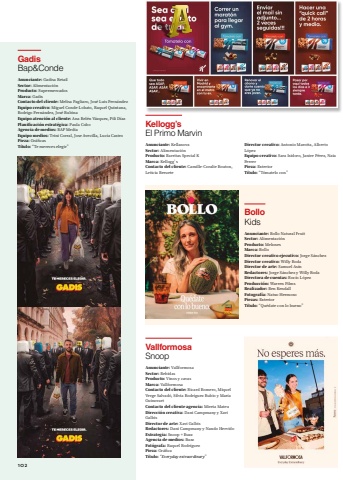 BolloKidsAnunciante: Bollo Natural FruitSector: AlimentaciónProducto: MelonesMarca: BolloDirector creativo ejecutivo: Jorge SánchezDirector creativo: Willy RodaDirector de arte: Samuel AsínRedactores: Jorge Sánchez y Willy RodaDirectora de cuentas: Rocío LópezProducción: Warren FilmsRealizador: Ben KendallFotografía: Natxo HermosoPiezas: ExteriorTítulo: “Quédate con lo bueno”GadisBap&CondeAnunciante: Gadisa RetailSector: AlimentaciónProducto: SupermercadosMarca: GadisContacto del cliente: Melisa Pagliaro, José Luis FernándezEquipo creativo: Miguel Conde-Lobato, Raquel Quintana, Rodrigo Fernández, José RubinaEquipo atención al cliente: Ana Belén Vázquez, Pili DíazPlanificación estratégica: Paula CoboAgencia de medios: BAP MediaEquipo medios: Trini Corral, Jose Avecilla, Lucía CastroPieza: GráficasTítulo: “Te mereces elegir”VallformosaSnoopAnunciante: VallformosaSector: BebidasProducto: Vinos y cavasMarca: VallformosaContacto del cliente: Ricard Romero, Miquel Verge Salvadó, Sílvia Rodríguez Rubio y María GuinovartContacto del cliente agencia: Mireia MateuDirección creativa: Dani Campmany y Xavi GalbisDirector de arte: Xavi GalbisRedactores: Dani Campmany y Nando HervidoEstrategia: Snoop + BuzzAgencia de medios: BuzzFotógrafa: Raquel RodríguezPieza: GráficaTítulo: “Everyday extraordinary”Kellogg’sEl Primo MarvinAnunciante: KellanovaSector: AlimentaciónProducto: Barritas Special KMarca: Kellogg’sContacto del cliente: Camille-Coralie Bouton, Leticia BerueteDirector creativo: Antonio Marotta, Alberto LópezEquipo creativo: Sara Isidoro, Janire Pérez, Naia FerrerPieza: ExteriorTítulo: “Tómatelo con”102