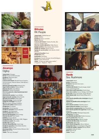 RenfeSra. RushmoreAnunciante: RenfeSector: TransportesProducto: Operador ferroviarioMarca: RenfeContacto del cliente: Ricardo Inoges, Isabel García, Rafael IzquierdoDirección creativa ejecutiva: Xisela LópezDirección creativa: Aurora Hidalgo, Noel FilardiRedacción: Sergio Fernández, Sergio MoralesDirección de arte: Marta Noval, Álvaro de la FuenteDirección de planificación estratégica: Raquel EspantaléonEquipo de planificación estratégica: Paula ValencianoDirección de cuentas: Gabriela LaisecaSupervisión de cuentas: Daniel SeguraDirección de comunicación: Inés FernándezDirección de producción (agencia): Noelia Lobo (Hogarth)Agencia de medios: Mediaplus EqumediaProductora: Lee FilmsCoordinador producción: Emilio CarnevauJefe de producción: Erika SaizProducción ejecutiva: Alfonso CuadraAyudante de dirección: Alex PozueloRealización: Marc OrtizDirección de fotografía: Alberto BañaresPostproducción: Javier Rodríguez (Hogarth)Estudio de sonido y música: Iberian MediaLocutores: Taller de RadioPieza: Spot TV 30”Título: “Poesía”BifrutasRK PeopleAnunciante: Calidad PascualSector: BebidasProducto: Zumos con lecheMarca: BifrutasContacto del cliente: Cristina Portillo, Mar Carrasco, Natalia LópezDirector creativo ejecutivo: Felipe RamosEquipo creativo: Aida Campos, Idoia AntónEquipo de cuentas: Mónica GarcíaEquipo de social media: Sofía Martín, Carlos RisueñoAgencia de medios: CaratProductora: IsolaRealizador: Paul SteinProducers: Gonzalo Boronat, Gerard RodríguezPiezas: 3 spots internet 20”Título: “No hay que darle tantas vueltas” (“Vaqueros”, “Ruptura”, “Peli”)AlcampoOgilvyAnunciante: AlcampoSector: Comercio/RestauraciónProducto: HipermercadosMarca: AlcampoContacto del cliente: Maribel García-Grajalva, Victoria Soriano, Patricia Gómez, Gala Morán y Natalia SalasDirector general creativo: Roberto FaraSupervisora creativa: Paloma del RíoDirector de arte: Jesús BeltránRedactora: Carmen FernándezDirectora general y client business partner:Vanesa PortoDirectora de cuentas: Laura RoldánSupervisora de cuentas: Clivia GuindoEjecutivo de cuentas: Pablo LópezHead of strategy: Concha SantiagoEquipo de estrategia: Eva GarcíaPR: Elvis Santos, Enrique CaballeroAgencia de medios: MediterráneaProductora: La QuadraRealizador: Nacho SánchezProductor ejecutivo: Nacho SánchezProducer: Ixai OlabarrietaJefe de producción: Rafa LisDirector de fotografía: Nono ArrugaDirector de arte: Fede DuarteEstilista: Vanessa MartínPostproducción: Moinimagen 1080 / HigginsEstudio de sonido: Dbc studioProducción: HogarthDirector de producción: Aarón LagoProductor ejecutivo: Pablo Riaño SánchezProducer: Roberto AriasBrand guardian: Hermán Muñoz (Botanic Ads)Pieza: Spot TV 45”Título: “Me voy p’Alcampo”103