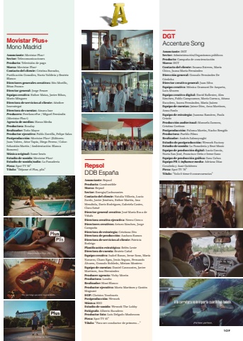 DGTAccenture SongAnunciante: DGTSector: Administración/Organismos públicosProducto: Campaña de concienciaciónMarca: DGTContacto del cliente: Susana Estevez, María Chico, Juana María FernándezDirección general: Gonzalo Fernández De CórdobaDirector creativo general: Juan SilvaEquipo creativo: Mónica Gramunt De Azqueta, Luis ÁlvarezEquipo creativo digital: David Ballester, Alex Sánchez, Pablo Campoamor, María Cuenca, Aitana Escudero, Izarra Fernández, María JuárezEquipo de cuentas: Jaime Díez, Aroa Martínez, Anna FanloEquipo de estrategia: Juanma Ramírez, Paula CriadoProducción audiovisual: Manuela Zamora, Cristina CortizasPostproducción: Paloma Martín, Nacho RengifoProductora: Pueblo FilmsRealizador: Andrés SalmoyraghiEstudio de postproducción: Wework FactoryEstudio de sonido: La Panadería y Beat MusicEquipo de producción digital: Lucía García, Nuria San José, Francisco Ortiz e Irene SanzEquipo de producción gráfica: Sara CubasEquipo PR & influence media: Adriana Díaz Covaleda y Auxi GutiérrezPieza: Spot TV 70”Título: “Solo 0 tiene 0 consecuencias”RepsolDDB EspañaAnunciante: RepsolProducto: CombustibleMarca: RepsolSector: Energía/CarburantesContacto del cliente: Natalia Villoria, Lucía Zurdo, Javier Jiménez, Esther Martín, Ana Mendiola, Darío Rodríguez, Gabriela Castro, Clara SatuéDirector general creativo: José María Roca de ViñalsDirectora creativa ejecutiva: Nerea CiercoDirectores creativos: Arturo Sánchez, Jorge CampañaDirectora de estrategia: Cristiana ZitoDirectora de producción: Azahara RamosDirectora de servicios al cliente: Patricia RodrigoPlanificación estratégica: Belén LesteDirectora de cuenta: Beatriz CañalEquipo creativo: Isabel Banzo, Irene Sanz, María Navarro, Charo Egea, Jesús Segura, Fernando Álvarez, Gonzalo Robledo, Miriam MonteroEquipo de cuentas: Daniel Caravantes, Javier Martínez, Ana HernándezProducer agencia: Vicky MorónProductora: LandiaRealizador: Maxi BlancoProductor ejecutivo: Marta Martínez y Gastón MagnaniDOP: Christos VoudourisPostproducción: WeworkMúsica: BSOEstudio de sonido: Wework The LobbyFotógrafo: Alberto EscuderoProductor foto: Luis Delgado MushroomPieza: Spot TV 45”Título: “Para ser conductor de primera...”Movistar Plus+Mono MadridAnunciante: Movistar Plus+Sector: TelecomunicacionesProducto: Televisión de pagoMarca: Movistar Plus+Contacto del cliente: Cristina Burzako, Purificación González, Nuria Valdivia y Beatriz BlancoDirectores generales creativos: Sito Morillo, Bitan FrancoDirector general: Jorge FesserEquipo creativo: Esther Matas, Javier Ribas, Mario MínguezDirectora de servicios al cliente: Aitziber IzurrateguiDirectora de cuentas: Ainara IzarProducers: FreelanceFor / Miguel Ferrándiz (Movistar Plus+)Agencia de medios: Havas MediaProductora: BosalayRealizador: Toño MayorProductor ejecutivo: Pablo Zorrilla, Felipe SalasPostproducción: Movistar Plus+ (Editores: Juan Valero, Aitor Tapia, Diego Perera / Color: Sebastián Martín / Ambientación: Blanca Romero)Música original: Sume beatsEstudio de sonido: Movistar Plus+Estudio de sonido/radio: La PanaderíaPieza: Spot TV 50”Título: “Déjame el Plus, plis”107