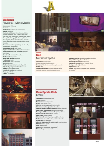WallapopRevuelta + Mono MadridAnunciante: WallapopSector: ServiciosProducto: Plataforma de compraventaMarca: WallapopContacto del cliente: Olivia Calafat, Rubén Navarro, Natacha Cano, Ángela García, Ana Seró, Edu Rojo, Adrià Valls, Joana Bernat, Eunice Torres, Alba Hidalgo, Julia Moisan, Federico Roccatagliata, Marta Gui, Marta Gui, Germán López, Manuela Nerini, Cristina Gómez, Elena CustodioDirección creativa ejecutiva: Jesús Revuelta, Bitan Franco, Sito MorilloDirección general: Jorge FesserEquipo creativo: Nieves López, Irene San JuanDirección de servicios al cliente: Aitziber IzurrateguiDirectora de cuentas: Ainara IzarProducer: FreelanceForAgencia de medios: InitiativeProductora: SmileRealización: Marc CorominasDOP: Lluís MartíProducción ejecutiva: Cristina EspañolEstudio de postproducción: StatementMúsica: Chaco Music HouseEstudio de sonido: La PanaderíaPieza: Spot TV 30”Título: “Guardamos”IkeaMcCann EspañaAnunciante: Grupo IngkaSector: Mobiliario y decoraciónProducto: Tiendas de mobiliario y decoraciónMarca: IkeaContacto del cliente: Gabriel Ladaria, Rafael Jiménez, Catarina Bastos, Alejandra SierraEquipo creativo: Emiliano González De Pietri, Miguel Madariaga, Óscar MartínezEquipo de estrategia: María GoñiEquipo de cuentas: Javier Pascual, Elena Rodríguez, María José CombaPieza: Spot TV 60”Título: “Los sueños empiezan aquí, permítete descansar”Duin Sports ClubErnestAnunciante: Duin Sports ClubSector: DeporteProducto: Centros deportivosMarca: Duin Sports ClubDirector creativo general: Nacho GuillóDirectora creativa ejecutiva: Tania RieraDirector de PR y asuntos públicos: Chapu ApaolazaHead of live experiences: Marta García ViudesHead of social & e-commerce: Borja López-GómezSupervisora de marca: Paula ParrillaHead of art: Nacho GómezDirectores de arte: Naya Layana y Johny AcostaRedactores: Samuel González y Xabier GonzálezProductora: La RemediosDirector de producción audiovisual: Israel MedranoEditora: Blanca AgudoDOP: Manuel ZafraPieza: Video resumen de la acción 60”Título: “Body core movement”109