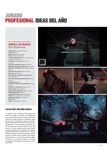 11IDEAS DEL AÑO nº 1727 28/04/2025 ideas del añoIDEAS DEL AÑOAtlético de MadridSra. RushmoreAnunciante: Atlético de MadridSector: DeporteProducto: Equipo de fútbolMarca: Atlético de MadridContacto del cliente: Rafael Alique, Javier Vaquerizo, Valerio GoriPresidente creativo: Miguel García VizcaínoDirectora general creativa: Marta RicoDirectora creativa ejecutiva: Xisela LópezDirectores creativos: Noel Filardi y Aurora HidalgoDirección de cuentas: Rocío CáceresEjecutivo: Ana CrespoDirección de comunicación (agencia):Inés FernándezDirección de producción (agencia): Iñaki SorianoProductora: AgostoProducción ejecutiva (productora): Belén GayánProductor (Productora): OImo HerasRealización: Miguel AnguloDirección de fotografía: Daniela CajíasPostproducción: JacarandaGestión de la música: Heaven MusicMúsica: City Lights de Austin FarwellEstudio de sonido: La PanaderíaPieza: Spot 2’Título: “Comandante y Cartón”LEALTAD ROJIBLANCALa lealtad es una decisión del alma. Bajo esta premisa, el Atlético de Madrid, en colaboración con la agencia Sra. Rushmore, lanzó una emotiva historia que rendía homenaje a la lealtad a través de dos perros: Comandante y Cartón, para recordarnos la importancia de ser fieles a los nuestros. Comandante, un perro enérgico y optimista, sueña con encontrar un hogar mientras vive en una perrera. Su rutina cambia cuando llega Cartón, un galgo marcado por el sufrimiento y el maltrato, quien transforma esta convivencia en un viaje de empatía y cuidados, donde los verdaderos valores surgen sin esperar nada a cambio. Esta creatividad buscaba ser un homenaje al espíritu atlético a través de un mensaje a su afición y al mundo: la verdadera victoria está en los actos que nacen del corazón.21