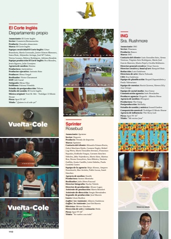 INGSra. RushmoreAnunciante: INGSector: FinanzasProducto: BancoMarca: INGContacto del cliente: Luis González Soto, Gema Ventosa, Virginia Soto Rodríguez, María José García Marrero, Marta Pujol y Cecilia Molinero.Director general creativo: César GarcíaDirector creativo y head of art: Ezequiel RuizRedacción: Luis GutiérrezDirectora de arte: Marta TaboadaCEO: Eva GutiérrezEquipo de planificación: Raquel Espantaleón y Paula ValencianoEquipo de cuentas: Rocío Cáceres, Nieves Gil y Ana CrespoEquipo de social media: Ana GarayComunicación agencia: Inés FernándezProducer agencia: Hogarth - Alberto PérezAgencia de medios: iProspectProductora: The GangPostproducción: McNultyEstudio de sonido y música: Sound GardenComposición musical: Trafalgar13 Music HouseAgencia de influencia: The Story LabPieza: Spot TV 45”Título: “Mi vecino Jose”SprinterRosebudAnunciante: SprinterSector: DeporteProducto: Tienda de deportesMarca: SprinterContacto del cliente: Eduardo Gómez Recio, Gabri Martínez Ojeda, Carmen Yagüe, Mabel Lag Pérez, Mario González Serrano, Francisco Espadas, Estíbaliz Vargas, Carmen Sánchez Niñoles, Jitka Vojteskova, Mario Sáez, Marina Box, Bruna Gonçalves, Sara Ribeiro, Davinia Guillén, Sonia Castillo, Leire Sádaba, Paula Candela CastroEquipo de la agencia: Majo Alonso, Amparo Domènech, Mar Arrieta, Pablo Lucas, Santi SánchezAgencia de medios: ZenithProductora: Somos MontañaRealizador: Julio Pérez PascualDirector fotografía: Nacho ToledoDirector de producción: Álvaro LagosAsistente de producción: Marta MonfortAsistente de dirección: Sergio HernándezSegundo de producción: José MarotoLuces: Llum StudiosGaffer/ 1er Asistente: Alberto GutiérrezGaffer/ 2o Asistente: José Del BarrioEléctrico: Héctor SánchezDirección de arte y vestuario: HedaPieza: Spot TV 20”Título: “Yo vuelvo con todo”El Corte InglésDepartamento propioAnunciante: El Corte InglésSector: Comercio/RestauraciónProducto: Grandes almacenesMarca: El Corte InglésEquipo creatividad El Corte Inglés: César Brandariz, María Coronado, Javier Gómez Blanzaco, Inma Ruiz, Alejandra Arriaga, José Mª Cañas, Teresa Lozano, Rebeca Rodríguez, Adriana BombínEquipo producción El Corte Inglés: Eva Morales, Jesús Siguero, Julio ConejeroAgencia de medios: DentsuProductora: AntiestáticoProductor ejecutivo: Antonio RuizProducer: Elena VergelRealizador: Víctor ClaramuntDOP: Juli CarnéFotógrafo: Elena OlayEstilismo: Paloma TiembloEstudio de postproducción: TelsonEstudio de sonido: El Corte InglésMúsica original: Toni M. Mir - Trafalgar 13 Music HousePieza: Spot TV 20”Título: “¡Quiero ir al cole ya!”110