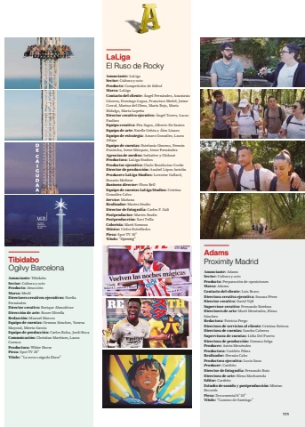 AdamsProximity MadridAnunciante: AdamsSector: Cultura y ocioProducto: Preparación de oposicionesMarca: AdamsContacto del cliente: Luis BravoDirectora creativa ejecutiva: Susana PérezDirector creativo: David VijilSupervisor creativo: Fernando EstebanDirectores de arte: Martí Menéndez, Elena SánchezRedactora: Patricia PregoDirectora de servicios al cliente: Cristina EsterasDirectora de cuentas: Sandra CabreraSupervisora de cuentas: Lidia Del PuertoDirectora de producción: Gemma SelgaProducer: Astriz MenéndezProductora: Cariñito FilmsRealizador: Hernán CaboProductora ejecutiva: Lucía SanzProducer: CariñitoDirector de fotografía: Fernando RuizDirectora de arte: Elena MarhuendaEditor: CariñitoEstudio de sonido y postproducción: Minino RecordsPieza: Documental 8’30”Título: “Camino de Santiago”LaLigaEl Ruso de RockyAnunciante: LaLigaSector: Cultura y ocioProducto: Competición de fútbolMarca: LaLigaContacto del cliente: Ángel Fernández, Anastasia Llorens, Domingo Legua, Francisco Medel, Jaime Corral, Marina del Olmo, María Rojo, María Hidalgo, María LapeñaDirector creativo ejecutivo: Ángel Torres, Lucas PaulinoEquipo creativo: Pita Sagra, Alberto De SantosEquipo de arte: Estelle Gehin y Álex LázaroEquipo de estrategia: Amaro González, Laura AlfayaEquipo de cuentas: Estefanía Gimeno, Fermín Fontecha, Irene Márquez, Irene FernándezAgencias de medios: Initiative y GlobantProductora: LaLiga StudiosProductor ejecutivo: Chalo Bonifacino CookeDirector de producción: Anabel López AntolínProducers LaLiga Studios: Lorraine Gallard, Rosario MolteniBusiness director: Flora BellEquipo de cuentas LaLiga Studios: Cristina González CalvoService: MañanaRealizador: Martes StudioDirector de fotografía: Carles F. GalíPostproductor: Martes StudioPostproducción: Xavi TrillaColorista: Marti SomozaMúsica: Cielos EstrelladosPieza: Spot TV 30”Título: “Opening”TibidaboOgilvy BarcelonaAnunciante: TibidaboSector: Cultura y ocioProducto: AtracciónMarca: MerlíDirectores creativos ejecutivos: Noelia FernándezDirector creativo: Enrique AlmodóvarDirección de arte: Roser OlivellaRedacción: Manuel MarcosEquipo de cuentas: Gemma Sánchez, Vanesa Mayoral, Mireia GarcíaEquipo de producción: Carlos Balsa, Jordi RocaComunicación: Christian Martínez, Laura CuencaProductora: White HorsePieza: Spot TV 20”Título: “La nova caiguda lliure”111