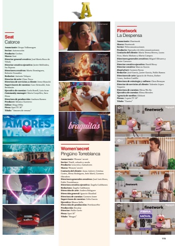 SeatCatorceAnunciante: Grupo VolkswagenSector: AutomociónProducto: CochesMarca: SeatDirector general creativo: José María Roca deViñalsDirector creativo ejecutivo: Javier Meléndez,Isa EsponaDirectores creativos: Marta Domínguez,Roberto GonzálezRedactor: Antonio VelayosDirector de arte: Clara TorraDirectora de servicios a cliente: Irene BianchiSupervisores de cuentas: Caro Sirimaldi, IvánBerdusánEjecutiva de cuentas: Carla Rosell, Laia AranCommunity manager: Marta Canyelles, SaraPérezDirectora de producción: Azahara RamosProducer: Mónica GuerreroEditor: Diego FélixPieza: Spot TV 30”Título:“Amores de verano”Women’secretPingüino TorreblancaAnunciante: Women’secretSector: Textil, calzado y modaProducto: Lencería y bañadoresMarca: Women’secretContacto del cliente: Anna Aubert, CristinaCastro, Elena Rodríguez, Inés Martí, CarmenObradorsDirectores generales creativos: José Luis Moro,Pablo TorreblancaDirectora creativa ejecutiva: Ángela CadiñanosRedactora: Ángela CadiñanosDirección de arte: Andrea BalaguerDirección general: Ignacio OlazábalDirectora de cuentas: Carmen AmerSupervisora de cuentas: Celia GarcíaEjecutiva: Blanca SollaDirección de producción: FreelanceForProducción: BosalayDirector: Pablo CurtoPieza: Spot 30”Título:“Bragas”FinetworkLa DespensaAnunciante: FinetworkMarca: FinetworkSector: TelecomunicacionesProducto: Operador de telecomunicacionesContacto del cliente: María Teresa Rivera, LauraPose, María Muñano y Marta CamposDirectores generales creativos: Miguel Olivares yJavier CarrascoDirector creativo ejecutivo: David RicoyDirector creativo: Marcos GarcíaHead of art: Carmen NavasRedactor: José García, Javier García, Pablo RamosDirectores de arte: Ignacio de Frutos, EstherCasas, Andrea CastilloDirectora de estrategia y cultura: Clara BenayasDirector de servicios al cliente: Valentín LópezVaqueroDirectora de cuentas: Elena Wu KoEjecutiva de cuentas: Elena MoralesAgencia de medios: GlobantPiezas: 2 spots TV 20”Título: “Gastos”115
