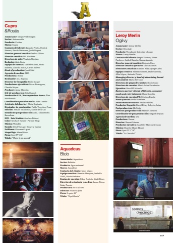 Leroy MerlinOgilvyAnunciante: Leroy MerlinSector: BricolajeProducto: Tiendas de bricolaje y hogarMarca: Leroy MerlinContacto del cliente: Sergio Vicente, ElviraPacheco, Aníbal Ramón, Nayra AguadoDirector general creativo: Roberto FaraDirector creativo ejecutivo: Chus RasinesDirectores creativos: Ramiro Alda y Jorge CalvoEquipo creativo: Alberto Gómez, Iñaki Garrido,Alba López, Antonio PelufoManaging director y head of advertising, brand and content: María HerranzDirectora de grupo de cuentas: Rocío CanoDirectora de cuentas: María Luisa FernándezEjecutivo: Moad El MatuchiBusiness partner & head of lifestyle, consumer goods and entertainment: Clara SanchísDirectora de cuentas PR: Cristina EscalaHead of social: Sofía MartínezSocial media executive: Paula NadalesProductor Hogarth: David Pita y Roberto AriasPostproducción: McNultyDirector postproducción: Manuel ZamoraCoordinador de postproducción: Miguel de JuanAgencia de medios: UMProductora: HawaiDirector: Bernat LiterasProductor ejecutivo: Ana Gil y Marcos SerranoMúsica: Chacho Music HousePieza: Spot TV 1’30”Título:“La Circular”AquadeusBtobAnunciante: AquadeusSector: BebidasProducto: Agua mineralMarca: AquadeusContacto del cliente: Maxi LópezEquipo creativo: Hernán Marques, IsabellaVidal, María OrdoñezEquipo de cuentas: Oskar Arriola, Iñaki RivasDirector de estrategia y medios: Laura Pérez,Itziar PuenteProductora: Yo vi al YetiDirector: Victor LópezPieza: 2 spots 20”Título:“Equilíbrate”Cupra&RosàsAnunciante: Grupo VolkswagenSector: AutomociónProducto: CochesMarca: CupraContacto del cliente: Ignacio Prieto, PatrickSievers, Paz de Dalmases, Judit RogentDirector general creativo: Isahac OliverDirector creativo: Pol MartínezDirectora de arte: Virginia NicolauRedactor: Aldo CosteEquipo de cuentas: Daniele Cicini, EnricSubirós, Claudia Matas, Carlos ValeroHead of production: Jordi SoléAgencia de medios: PHDProductora: RomaRealizador: J.A. BayonaDirector de fotografía: Pedro LuqueProductores ejecutivos: Oscar Romagosa,Claudia MayerProducer: Anna MayolasJefe de producción: Cris GuaschProducción VFX / Postsupervisor Roma: ÁlexMaldonadoCoordinadora post de &Rosàs: Meri LosadaAsistente del director: Alicia ReginatoDiseñador de producción: Pablo Tregebov-PozaEdición: Arnald Viladomat, Guille de la CalEstudio de postproducción: Zoic / GlassworksBarcelonaECD - Zoic Studios: Aladino DebertColor: Michael Hatzer - Picture ShopMúsica: WoraklsSonido: Oriol Tarragó - Coser y CantarEstilismo: Giovanni LipariMaquillaje: Manel RosaPieza: Spot TV 130”Título:“There is no second”117