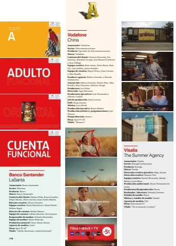 Banco SantanderLaSantaAnunciante: Banco SantanderSector: FinanzasProducto: BancoMarca: Banco SantanderContacto del cliente: Marina Peña, Rosa González,Felipe Martín, Alicia Gavela y Juan Carlos MartínDirector creativo: Álvaro GuzmánEquipo creativo: Paula Hirschhorn, María Nistal,Delfina RigoliDirector de cuentas: Rubén MateosEquipo de cuentas: Adrián Sánchez, Sete LinaresResponsable de medios: Yolanda MenéndezEquipo de medios: Marta RedondoProductora musical: Chaco Music HouseAgencia de medios: CaratPieza: Spot TV 60”Título:“Adulto funcional, cuenta funcional”VodafoneChinaAnunciante: VodafoneSector: TelecomunicacionesProducto: Operador de telecomunicacionesMarca: VodafoneContacto del cliente: Patricia Fresneda, EvaJiménez, Soledad Carvajal, José Manuel Gutiérrezy Sara GallegoEquipo creativo: Rafa Antón, Darío Busto, RafaGil, Lola Guillén, Javier PeñalbaEquipo de cuentas: Mayte Flores, Nato Carreroy Alba RanillaProducer agencia: Rebeca Garrobo y HernánZubizarretaContent lab: Rebeca Garrobo, Rubén Díaz, AlbaRanilla, Mara Llorente, Adriana OrtegaProductora: Lee FilmsDirección: Agus BerruezoProductores ejecutivos: Iván Fernández yAlfonso CuadraJefa de producción: Iván LorenzoDOP: Borja LlorensMúsica: Love MonkProducción ejecutiva: Bruno MuñozProducción artística y programaciones: JoséÁlvarezPostproducción: SerenaPieza: Spot TV 20”Título:“Hamaca”VisaliaThe Summer AgencyAnunciante: VisaliaSector: Energía/CarburantesProducto: EnergíaMarca: VisaliaDirección creativa ejecutiva: Iñigo AncizuDirección creativa: Mamen TatoEquipo creativo: Daniel Hernando, MartínManso y Luis MozoProducción audiovisual: Álvaro Fernández deAraozProductora/Postproducción: HarryRealizador / directora: Yolanda CentenoEstudio de sonido: HarryMúsica y estudio de sonido: YembéAgencia de medios: T2óPieza: Documental 4’Título:“No es normal, es mejor”118