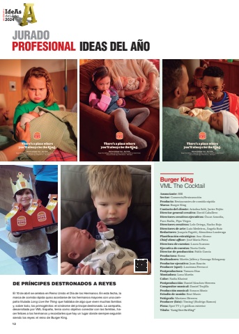 12XXVIII AnunciosIDEAS DEL AÑOXXVIII Anuncios2024IDEAS DEL AÑOBurger KingVML The CocktailAnunciante: RBISector: Comercio/RestauraciónProducto: Restaurantes de comida rápidaMarca: Burger KingContacto del cliente: Ariadna Solé, Javier PejitoDirector general creativo: David CaballeroDirectores creativos ejecutivos: Óscar Amodia, Paco Badía, Pipo VirgosDirectores creativos: Lolo Ortega, Nacho RojoDirectores de arte: Luiz Medeiros, Ángela RuizRedactores: Joaquín Fagetti, Almudena LuzárragaPlanificación estratégica: Ana AlonsoChief client officer: José María PieraDirectora de cuentas: Laura ScaranoEjecutiva de cuentas: Nuria GrelaDirector de producción: Pablo GarcíaProductora: RomaRealizadores: Martín Jalfen y Gonzaga EchegarayProductor ejecutivo: Juan BascónProducer (spot): Laureana FerrucciPostproductora: Tamara DíazMontadora: Luna MartínColor: Nadia KhairatPostproducción: Daniel Sánchez-HerreraCompositor musical: Daniel TrujilloProducción musical: Sonaos MusicEstudio de sonido: Beat MusicFotógrafo: Mariano HerreraProducer (foto): Timing! (Rodrigo Ramos)Pieza: Spot TV y 3 gráficas exteriorTítulo: “Long live the King”DE PRÍNCIPES DESTRONADOS A REYESEl 10 de abril se celebra en Reino Unido el Día de los Hermanos. En esta fecha, la marca de comida rápida quiso acordarse de los hermanos mayores con una campaña titulada Long Live the Thing que hablaba de algo que viven muchas familias y, sobre todo, los primogénitos: el síndrome del príncipe destronado. La campaña, desarrollada por VML España, tenía como objetivo conectar con las familias, hacer felices a los hermanos y recordarles que hay un lugar donde siempre seguirán siendo los reyes: el reino de Burger King.22