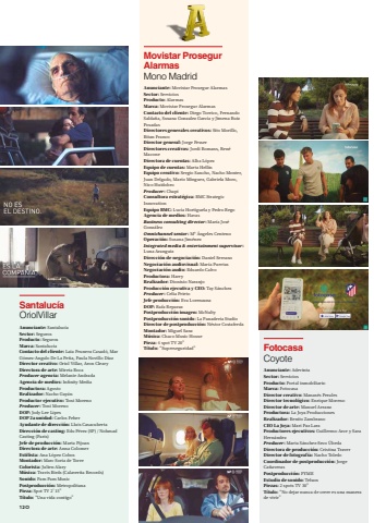 Santalucía OriolVillarAnunciante: SantalucíaSector: SegurosProducto: SegurosMarca: SantalucíaContacto del cliente: Laia Prunera Casadó, Mar Gómez-Angulo De La Peña, Paula Novillo DíazDirector creativo: Oriol Villar, Aron ClearyDirectora de arte: Mireia RocaProducer agencia: Melanie AndradaAgencia de medios: Infinity MediaProductora: AgostoRealizador: Nacho GayánProductor ejecutivo: Toni MorenoProducer: Toni MorenoDOP: Jody Lee LipesDOP 2a unidad: Carlos FeherAyudante de dirección: Lluis CasacubertaDirección de casting: Edu Pérez (SP) / Nohmad Casting (Paris)Jefe de producción: Marta PijoanDirectora de arte: Anna ColomerEstilista: Ana López CobosMontador: Marc Soria de TorreColorista: Julien AlaryMúsica: Travis Birds (Calaverita Records)Sonido: Pam Pam MusicPostproducción: MetropolitanaPieza: Spot TV 2’15”Título: “Una vida contigo”Movistar Prosegur AlarmasMono MadridAnunciante: Movistar Prosegur AlarmasSector: ServiciosProducto: AlarmasMarca: Movistar Prosegur AlarmasContacto del cliente: Diego Torrico, Fernando Saldaña, Susana Gonzalez García y Jimena Ruiz PosadasDirectores generales creativos: Sito Morillo, Bitan FrancoDirector general: Jorge FesserDirectores creativos: Jordi Romans, René MaconeDirectora de cuentas: Alba LópezEquipo de cuentas: Marta HellínEquipo creativo: Sergio Sancho, Nacho Monter, Juan Delgado, Mario Mínguez, Gabriela Moro, Nico HuidobroProducer: ChapiConsultora estratégica: BMC Strategic InnovationEquipo BMC: Lucía Hortiguela y Pedro RegoAgencia de medios: HavasBusiness consulting director: María José GonzálezOmnichannel senior: Mª Ángeles CentenoOperación: Susana JiménezIntegrated media & entertainment supervisor:Luna AranguizDirección de negociación: Daniel SerranoNegociación audiovisual: María PuertasNegociación audio: Eduardo CalvoProductora: HarryRealizador: Dionisio NaranjoProducción ejecutiva y CEO: Tay SánchezProducer: Celia PrietoJefe producción: Eva LorenzanaDOP: Rafa ReparazPostproducción imagen: McNultyPostproducción sonido: La Panadería StudioDirector de postproducción: Néstor CostafredaMontador: Miguel SanzMúsica: Chaco Music HousePieza: 4 spot TV 20”Título: “Superseguridad” FotocasaCoyoteAnunciante: AdevintaSector: ServiciosProducto: Portal inmobiliarioMarca: FotocasaDirector creativo: Manasés PeralesDirector tecnológico: Enrique MorenoDirector de arte: Manuel ArranzProductora: La Joya ProduccionesRealizador: Benito ZambranoCEO La Joya: Mari Paz LaraProductores ejecutivos: Guillermo Arce y Sara HernándezProducer: Marta Sánchez-Seco ÚbedaDirectora de producción: Cristina TraverDirector de fotografía: Nacho ToledoCoordinador de postproducción: Jorge CañaverasPostproducción: FYMEEstudio de sonido: TelsonPiezas: 2 spots TV 30”Título: “No dejar nunca de creer es una manera de vivir”120