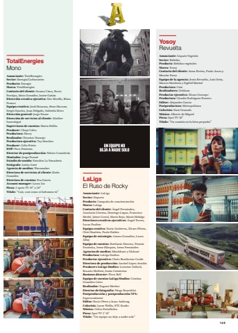 TotalEnergiesMonoAnunciante: TotalEnergiesSector: Energía/CarburantesProducto: EnergíaMarca: TotalEnergiesContacto del cliente: Susana Cima, Rocío Pontijas, Idoia González, Iratxe GañánDirección creativa ejecutiva: Sito Morillo, Bitan FrancoEquipo creativo: Jordi Romans, Rene Macone, Sergio Sancho, Juan Delgado, Gabriela MoroDirección general: Jorge FesserDirección de servicios al cliente: Aitziber IzurrateguiSupervisora de cuentas: Marta HellínProducer: Chapi CalvoProductora: HarryRealizador: Dionisio NaranjoProductora ejecutiva: Tay SánchezProducer: Celia PrietoDOP: Paco FemeniaDirector de postproducción: Néstor CostafredaMontador: Jorge PunsetEstudio de sonido: Estudios La PanaderíaFotógrafo: Antón GoiriAgencia de medios: WavemakerDirectora de servicios al cliente: Maite GonzálezDirectora de cuentas: Eva GarcíaAccount manager: Laura LizPieza: 2 spots TV 45” y 20”Título:“Casi, casi como si fuéramos tú”LaLigaEl Ruso de RockyAnunciante: LaLigaSector: DeporteProducto: Campaña de concienciaciónMarca: LaLigaContacto del cliente: Ángel Fernández, Anastasia Llorens, Domingo Legua, Francisco Medel, Jaime Corral, María Rojo, María HidalgoDirectores creativos ejecutivos: Ángel Torres, Lucas PaulinoEquipo creativo: Nuria Gutiérrez, Álvaro Flórez, Chiri Bautista, Paula IbáñezEquipo de estrategia: Amaro González, Laura AlfayEquipo de cuentas: Estefanía Gimeno, Fermín Fontecha, Irene Márquez, Irene FernándezAgencias de medios: Mindshare y GlobantProductora: LaLiga StudiosProductor ejecutivo: Chalo Bonifacino CookeDirectora de producción: Anabel López AntolínProducers LaLiga Studios: Lorraine Gallard, Rosario Molteni, Sonia CremeriusBusiness director: Flora BellEquipo de cuentas LaLiga Studios: Cristina González CalvoRealizador: Eugene MerherDirector de fotografía: Diego RosenblatPostproducción y postproducción VFX:SupercontinentEditor: Rocío Pérez y Isaac AmboagColorista: Jason Wallis, ETC StudioMúsica: Cielos EstrelladosPieza: Spot TV 2’10”Título: “Un equipo no deja a nadie solo”YosoyRevueltaAnunciante: Liquats VegetalsSector: BebidasProducto: Bebidas vegetalesMarca: YosoyContacto del cliente: Anna Rovira, Paula Arcas y Merche ParraEquipo de la agencia: Jesús Revuelta, Luis Ortiz, Marcos Martínez y Sigfrid MarinéProductora: CuteRealizadores: OckhamProductor ejecutivo: Álvaro GorospeProductora: Claudia Rodríguez-PorreroEditor: Alejandro GarcíaPostproductora: MetropolitanaColorista: Dani GranadoMúsica: Alberto de MiguelPieza: Spot TV 30”Título:“Un camión en la letra pequeña”123