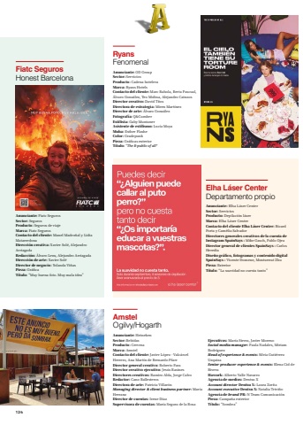 RyansFenomenalAnunciante: OD GroupSector: ServiciosProducto: Cadena hoteleraMarca: Ryans HotelsContacto del cliente: Marc Rahola, Berta Pascual, Álvaro González, Teo Molina, Alejandro CainzosDirector creativo: David TitosDirectora de estrategia: Miren MartínezDirector de arte: Álvaro GonzálezFotografía: Q&CumberEstilista: Gaby MuntanerAsistente de estilismo: Lucía MoyaMuha: Esther FlasheColor: GradepunkPieza: Gráficas exteriorTítulo: “The R-public of all”Fiatc SegurosHonest BarcelonaAnunciante: Fiatc SegurosSector: SegurosProducto: Seguros de viajeMarca: Fiatc SegurosContacto del cliente: Manel Madroñal y Lidia MatarredonaDirección creativa: Xavier Solé, Alejandro ArriagadaRedacción: Álvaro Lens, Alejandro ArriagadaDirección de arte: Xavier SoléDirector de negocio: Yolanda ViñasPieza: GráficaTítulo: “Muy buena foto. Muy mala idea”AmstelOgilvy/HogarthAnunciante: HeinekenSector: BebidasProducto: CervezaMarca: AmstelContacto del cliente: Javier López - Valcárcel Herrero, Ana Martín de Bernardo PfarrDirector general creativo: Roberto FaraDirector creativo ejecutivo: Jesús RasinesDirectores creativos: Ramiro Alda, Jorge CalvoRedactor: Cano BallesterosDirectora de arte: Patricia VillarónManaging director & client business partner: María HerranzDirector de cuentas: Irene DíazSupervisora de cuentas: María Segura de la RosaEjecutivos: María Sierra, Javier MorenoSocial media manager: Paula Nadales, Miriam RodríguezHead of experience & events: Silvia Gutiérrez UzquizaSenior producer experience & events: Elena Cid de RiveraHawork: Alberto Valle NavarroAgencia de medios: Dentsu XAccount director Dentsu X: Laura ZoritaAccount executive Dentsu X: Natalia TriviñoAgencia de brand PR: N Team ComunicaciónPieza: Campaña exteriorTítulo: “Sombra”Elha Láser CenterDepartamento propioAnunciante: Elha Láser CenterSector: ServiciosProducto: Depilación láserMarca: Elha Láser CenterContacto del cliente Elha Láser Center: Ricard Porta y Camèlia SalvadorDirectores generales creativos de la cuenta de Instagram SpainSays : Mike Gasch, Pablo OjeaDirector general de clientes SpainSays : Carlos HerediaDiseño gráfico, fotogramas y contenido digital SpainSays : Vicente Domene, Montserrat ZhuPieza: ExteriorTítulo: “La suavidad no cuesta tanto”124