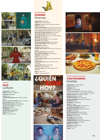 Casa TarradellasOriolVillarAnunciante: Casa TarradellasSector: AlimentaciónProducto: PizzaMarca: Casa TarradellasContacto del cliente: M. Dolors Roca, Jordina Puigdomenech Raurell, Anna Capdevila, Nil SañasEquipo creativo: Oriol Villar, TuningDirector de arte: Oriol GilProducer agencia: Pau CabarrocasAgencia de medios: Difusión y AudienciasProductora: RomaRealizador: Martín JalfenDOP: Pol G. SalaAyudante de dirección: Sílvia MartínezDirección de casting: Edu PérezProductor ejecutivo: Pablo García AcónProducer: Tània RuizJefe de producción: Norma MarcosDirector de arte: Andrea GandarillasEstilista: Néstor ReinaMontador: Ramón MorejónPostproductor: Tamara DíazPostproducción: Daniel Sánchez-HerreraEstudio de sonido: Xevi EstudiMúsica: Toni M. MirLocutora: Meritxell CalvoPieza: Spot TV 30”Título: “Tías”EuskaltelDimensiónAnunciante: MásOrangeSector: TelecomunicacionesProducto: Operadora de telecomunicacionesMarca: EuskaltelContacto del cliente: Jacobo Gálvez, Ana Torres, Andrea Naverán, Eider Rodríguez, Eloien UriarteDirección general creativa: Guillermo ViglioneDirección creativa ejecutiva: Paco CabreraDirección creativa: Borja UsandizagaDirección de arte: María Arrieta, Iñaki HuegunRedactor: Unai MartínezDirección de cuentas: Laura AristeguietaEjecutiva: Joane IglesiasDirección de producción: Natxo EscobarAgencia de medios: Gestión de MediosProductora: AdhokersDirector: Miquel AlcarriaProducción ejecutiva: Beatriz Acinas, José Luis TejedorJefa de producción: Eloisa BáliusDirección de fotografía: Olmo SobrinoMontaje: Vicente ÁlvarezMúsica: Dani VenegasCorrección de color: Moncho Sánchez-Gómez / Higgins PostPostproducción: Eneko Fernández, Laura RodríguezSonorización: Mediavox EstudioVoiceover: Asier HormazaLocución cuñas: Borja Usandizaga, Unai MartínezPieza: 3 spot TV 30”Título: “¿Quién elige hoy?”NoritLa BuenaAnunciante: AC MarcaSector: Limpieza y drogueríaProducto: DetergenteMarca: NoritContacto del cliente: Isabel del Haro, Mireia AbadDirector creativo ejecutivo: Álber FernándezDirector de arte: Oscar MarchalDirectora de cuentas: Chantal GallartAgencia de medios: Havas MediaProductora: BosalayRealizadores: Los CangrejosProducción musical: OEOPieza: Spot TV 20”Título: “Me siento Norit”125