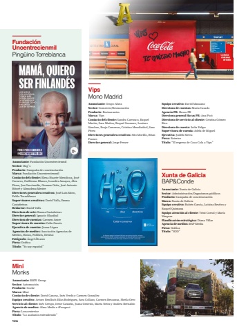 VipsMono MadridAnunciante: Grupo AlseaSector: Comercio/RestauraciónProducto: RestaurantesMarca: VipsContacto del cliente: Sandra Carrasco, RaquelMartín, Sara Muñoz, Raquel Sesmero, LautaroSánchez, Borja Cameron, Cristina Mendizábal, SaraPérezDirectores generales creativos: Sito Morillo, BitanFrancoDirector general: Jorge FesserEquipo creativo: David ManzanoDirectora de cuentas: María CasadoAgencia PR: Havas PRDirectora general Havas PR: Ana PicóDirectora de servicio al cliente: Cristina GómezRicoDirectora de cuenta: Sofía FelipeSupervisora de cuenta: Adela de MiguelEjecutiva: Judith SierraPieza: ExteriorTítulo: “El regreso de Coca-Cola a Vips”Fundación UnoentrecienmilPingüino TorreblancaAnunciante: Fundación UnoentrecienmilSector: Ong’sProducto: Campaña de concienciaciónMarca: Fundación UnoentrecienmilContacto del cliente: Elena Huarte-Mendicoa, JoséCarnero, Guillermo Blanco, Lourdes Amayas, ÁlexPérez, Jon Garciandia, Gemma Ortiz, José AntonioRitoré y Almudena MestreDirectores generales creativos: José Luis Moro,Pablo TorreblancaSupervisores creativos: David Valls, EmmaCastañeirasRedactor: David VallsDirectora de arte: Emma CastañeirasDirector general: Ignacio OlazábalDirectora de cuentas: Carmen AmerSupervisora de cuentas: Celia GarcíaEjecutiva de cuentas: Joana LópezAgencias de medios: Asociación Agencias deMedios, Havas, Publicis, DentsuFotógrafo: Ángel ÁlvarezPieza: GráficaTítulo:“Yo soy español”Xunta de GaliciaBAP&CondeAnunciante: Xunta de GaliciaSector: Administración/Organismos públicosProducto: Campaña de concienciaciónMarca: Xunta de GaliciaEquipo creativo: Rubén García, Luisina Restivo yRaquel QuintanaEquipo atención al cliente: Trini Corral y MaríaVázquezPlanificación estratégica: Diana VillarAgencia de medios: BAP MediaPieza: GráficaTítulo:“H2O”126MiniMonksAnunciante: BMW GroupSector: AutomociónProducto: CocheMarca: MiniContacto de cliente: David Canosa, Inés Verdú y Carmen GonzálezEquipo creativo: Arturo Benlloch Elías Rodríguez, Sara Collazo, Carmen Bescansa, Sheila OrroServicio al cliente: Inés Crespo, Irene Castaño, Joana Genesio, Marta Neira y Andrea BernaldoAgencia de medios: Alma Media e iProspectPieza: Lona exteriorTítulo:“Lo acabarás entendiendo”
