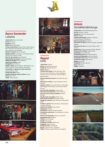 Banco SantanderLaSantaAnunciante: Banco SantanderSector: FinanzasProducto: BancoMarca: Banco SantanderContacto del cliente: Marina Peña, Felipe Martín,Rosa González, Raúl García, Alicia Gavela, JuanCarlos Martín, Luis GabaldónDirector creativo: Álvaro GuzmánEquipo creativo: Ana Ayuso, Lucía Agudo, MaríaNistal, Juan Antonio CarrilloDirector de cuentas: Rubén MateosResponsable de medios: Yolanda MenéndezEquipo de medios: Marta RedondoAgencia de medios: CaratFotografía: Javier BioscaEquipo Aitana: Nuria Andreu, Valle Jiménez, IsaGreece, Alex Gil, Jesús de Paula, Alex SaintDiscográfica y agencia de representación:Universal Music, GTSProducción spot: RomaProducción piezas redes sociales: SerenaPieza: Spot TV 20”Título:“Bienestando”RepsolDDBAnunciante: RepsolSector: Energía/CarburantesProducto: Energía eléctricaMarca: RepsolContacto del cliente: Paula Martínez, AlbaEsteban, Diana Ballesteros, Darío Rodríguez,Gabriela Castro, Lucía Calvo, Paola Seivane yEsther MartínDirector general creativo: José María Roca deViñalsDirectores creativos: Jorge Campaña y ArturoSánchezEquipo creativo: Fernando Álvarez, Charo Egea,Jesús Segura, Isabel Banzo, Irene Sanz y MaríaNavarroDirectora de estrategia: Cristiana ZitoDirectora de producción: Azahara RamosDirectora de servicios al cliente: PatriciaRodrigoPlanificación estratégica: Belén LesteDirector de la cuenta: Fernando LozanoEquipo de cuentas: Javier Martínez y EsmeraldaInabaProducer agencia: Berta Martínez, Vicky Moróny Mónica GuerreroAgencia de medios: Havas MediaProductora: PuebloRealizador: Augusto Giménez ZapiolaProductores ejecutivos: Toni Martínez y VanesaSan MillánDirector de fotografía: Christos VoudourisPostproducción: WeWorkMúsica: Lucas ZapiolaSonido: The LobbyProductora de foto: MushroomFotógrafo: Carles CarabíProductor foto: Luis DelgadoPiezas: 3 spots TV 30”y 3 gráficasTítulo:“Despreocúpate de la luz con Repsol”AirbnbSantaMarta&AstorgaAnunciante: Airbnb Marketing ServicesSector: Turismo y viajesProducto: Reserva de alojamientosMarca: AirbnbContacto del cliente: Andreu Castellano,Cristina Ramón y Júlia RomaDirector general: Marc MaciàDirectores creativos: Alberto Astorga, FernandoCodinaDirectores de arte: Fernando Codina y GinaLarrosaRedactores: Alberto Astorga y María AlbanellDirectora de cuentas: Sandra LópezRealizador: Joan VallverdúProduction service: Las HermanísimasDirector de fotografía: José Luis BernalPostproducción: Higgins PostproductionEstudio de sonido: Idea SonoraMúsica: Joan VilàFotógrafo: Mariano HerreraPieza: Vídeo 30”Título:“Caminos”128