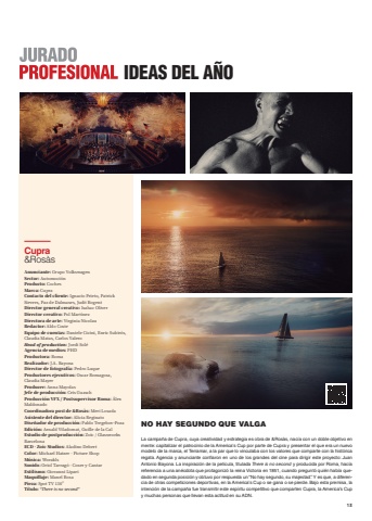 13IDEAS DEL AÑOXXVIII Anuncios2024Cupra&RosàsAnunciante: Grupo VolkswagenSector: AutomociónProducto: CochesMarca: CupraContacto del cliente: Ignacio Prieto, Patrick Sievers, Paz de Dalmases, Judit RogentDirector general creativo: Isahac OliverDirector creativo: Pol MartínezDirectora de arte: Virginia NicolauRedactor: Aldo CosteEquipo de cuentas: Daniele Cicini, Enric Subirós, Claudia Matas, Carlos ValeroHead of production: Jordi SoléAgencia de medios: PHDProductora: RomaRealizador: J.A. BayonaDirector de fotografía: Pedro LuqueProductores ejecutivos: Oscar Romagosa, Claudia MayerProducer: Anna MayolasJefe de producción: Cris GuaschProducción VFX / Postsupervisor Roma: Álex MaldonadoCoordinadora post de &Rosàs: Meri LosadaAsistente del director: Alicia ReginatoDiseñador de producción: Pablo Tregebov-PozaEdición: Arnald Viladomat, Guille de la CalEstudio de postproducción: Zoic / Glassworks BarcelonaECD - Zoic Studios: Aladino DebertColor: Michael Hatzer - Picture ShopMúsica: WoraklsSonido: Oriol Tarragó - Coser y CantarEstilismo: Giovanni LipariMaquillaje: Manel RosaPieza: Spot TV 130”Título: “There is no second”NO HAY SEGUNDO QUE VALGALa campaña de Cupra, cuya creatividad y estrategia es obra de &Rosàs, nacía con un doble objetivo en mente: capitalizar el patrocinio de la America’s Cup por parte de Cupra y presentar el que era un nuevo modelo de la marca, el Terramar, a la par que lo vinculaba con los valores que comparte con la histórica regata. Agencia y anunciante confiaron en uno de los grandes del cine para dirigir este proyecto: Juan Antonio Bayona. La inspiración de la película, titulada There is no second y producida por Roma, hacía referencia a una anécdota que protagonizó la reina Victoria en 1851, cuando preguntó quién había quedado en segunda posición y obtuvo por respuesta un “No hay segundo, su majestad”. Y es que, a diferen,cia de otras competiciones deportivas, en la America’s Cup o se gana o se pierde. Bajo esta premisa, la intención de la campaña fue transmitir este espíritu competitivo que comparten Cupra, la America’s Cup y muchas personas que llevan esta actitud en su ADN.IDEAS DEL AÑO24