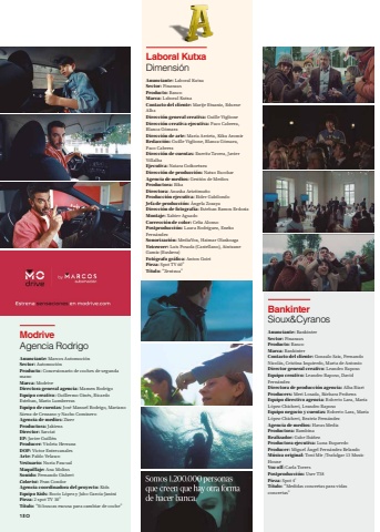 ModriveAgencia RodrigoAnunciante: Marcos AutomociónSector: AutomociónProducto: Concesionario de coches de segundamanoMarca: ModriveDirectora general agencia: Mamen RodrigoEquipo creativo: Guillermo Ginés, RicardoEsteban, Mario LumbrerasEquipo de cuentas: José Manuel Rodrigo, MarianoSáenz de Cenzano y Nacho ComineroAgencia de medios: ZizerProductora: JakiensDirector: SarciatEP: Javier GuillénProducer: Violeta HerranzDOP: Víctor EntrecanalesArte: Pablo VelascoVestuario: Nuria PascualMaquillaje: Ana MolinsSonido: Fernando GisbertColorist: Fran CondorAgencia coordinadora del proyecto: KidsEquipo Kids: Rocío López y Jabo García-JaniniPieza: 2 spot TV 30”Título:“Si buscas excusa para cambiar de coche”Laboral KutxaDimensiónAnunciante: Laboral KutxaSector: FinanzasProducto: BancoMarca: Laboral KutxaContacto del cliente: Marije Etxaniz, EdurneAlbaDirección general creativa: Guille ViglioneDirección creativa ejecutiva: Paco Cabrera,Blanca GómaraDirección de arte: María Arrieta, Kiku AromirRedacción: Guille Viglione, Blanca Gómara,Paco CabreraDirección de cuentas: Eneritz Tavera, JavierVillalbaEjecutiva: Naiara GoikoetxeaDirección de producción: Natxo EscobarAgencia de medios: Gestión de MediosProductora: EikaDirectora: Anuska AriztimuñoProducción ejecutiva: Eider GabilondoJefa de producción: Ángela ZozayaDirección de fotografía: Esteban Ramos ErdoziaMontaje: Xabier AguadoCorrección de color: Celia AlonsoPostproducción: Laura Rodríguez, EnekoFernándezSonorización: MediaVox, Haimar OlaskoagaVoiceover: Luis Posada (Castellano), AintzaneGamiz (Euskera)Fotógrafo gráfica: Anton GoiriPieza: Spot TV 60”Título:“Zentzua”BankinterSioux&CyranosAnunciante: BankinterSector: FinanzasProducto: BancoMarca: BankinterContacto del cliente: Gonzalo Saiz, FernandoNicolás, Cristina Izquierdo, Marta de AntonioDirector general creativo: Leandro RaposoEquipo creativo: Leandro Raposo, DavidFernándezDirectora de producción agencia: Alba RiartProducers: Meri Losada, Bárbara ProhensEquipo directivo agencia: Roberto Lara, MaríaLópez-Chicheri, Leandro RaposoEquipo negocio y cuentas: Roberto Lara, MaríaLópez-Chicheri, Beatriz FernándezAgencia de medios: Havas MediaProductora: BambinaRealizador: Gabe IbáñezProductora ejecutiva: Luna EsquerdoProducer: Miguel Ángel Fernández BelandoMúsica original: Toni Mir /Trafalgar 13 MusicHouseVoz off: Carla TorresPostproducción: User T38Pieza: Spot 4’Título: “Medidas concretas para vidasconcretas”130