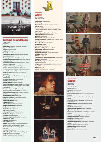 ADEE&RosàsAnunciante: ADEE EspañaSector: Ong’sProducto: Campaña de concienciaciónMarca: ADEEContacto del cliente: Carolina Puente, Marta Castillo, Sonia Sestelo, Àngels Gutiérrez, JosepMaria AlañaDirector general creativo: Isahac OliverDirector creativo: Pol MartínezRedactor: Aldo CosteDirectora de arte: Virginia NicolauEquipo de cuentas: Daniele Cicini, Claudia Matas, Irene MosqueraHead of production: Jordi SoléProductora: RomaDirectora: Claudia BarralDirector de fotografía: Josep PardoDirectora de arte: Laura HerranzEstilismo: Beatriz GarcíaProductor ejecutivo: Pablo García AcónProducer: Tània RuizEdit: Tamara TorresCoordinadora de postproducción: Tamara DiezMúsica: Dani TrujilloEstudio de postproducción: MetropolitanaColor: Marc MoratóResponsable comunicación PR: Laura Corvo – Liquid FellowsPieza: Spot 1’40”Título: “Los bufones de Velázquez”MapfreBurnsAnunciante: MapfreSector: SegurosProducto: AseguradoraMarca: MapfreContacto del cliente: Enrique Aguado y Andrea SchifittoDirección general: Carla Alexander y Raquel SerónDirección creativa ejecutiva: Pablo Madrid y Pablo SalinasEquipo creativo: Mikel Fernández y Daniela BoteroProducer: Guillem GarcíaSupervisora de cuentas: María RodríguezEjecutiva: Alicia DíazSupervisor de contenido: Javier Tejero y Cristina DonosoDirectora de estrategia: Susana OuteiriñoPlanner estratégico: Antonio MárquezProductora: Instante StudioRealizador: Ester G. MeraProductores ejecutivos: José Pérez y Guillermo MartínDirector de fotografía: Carlos RodilComunicación: Marta GutiérrezPieza: Spot 30”Título: “Acompañamos tu cambio”Turismo de AndalucíaOgilvyAnunciante: Empresa Pública de Turismo y Deporte de AndalucíaSector: Turismo y viajesProducto: TurismoMarca: Turismo de AndalucíaContacto del cliente: Lisardo Morán, Juanma Ortiz, Adrián GómezDirector general creativo: Roberto FaraDirector creativo ejecutivo: Juan Pedro Moreno y Javier SenovillaDirectores creativos: Miguel Provencio, Víctor Vázquez y Alex MaggieEquipo creativo: Alejandra Vallejo, Lucía Moreno, Marta Galán, Mateo López, Leo Fernández, Sandra Sánchez, Sonia Herráez, Alex Bernabé, Nerea Pascual, Jaime SastreProducer Ogilvy: Fernando Albor, Miguel HernándezManaging director & client business partner:Vanesa PortoDirectora de cuentas: Laura RoldánEjecutiva: María JiménezHead of strategy: Concha SantiagoChief PR & Influence Ogilvy Spain: Elvis SantosHead of consumer and disruptive brands PR:Clara SanchísDirectora de cuentas PR: Cristina EscalaSupervisora de cuentas PR: Nerea GarcíaCommunications director: Enrique CaballeroProduction house: HogarthMoving images lead: Aaron LagoExecutive producer: Pablo Riaño SánchezProducers: Roberto AriasAgencia de medios: CaratProductora: RomaCEO productora: Pablo García AcónProductor ejecutivo: Juan BascónProducer: Laureana FerrucciRealizador: Manu MazzaroDoP: Pablo ClementeJefe de producción: Valeria TarsitanoProduction designer: Cora PatiñoEstilismo: Zaida RodríguezDirectora de postproducción: Tamara DiazEditor: Rocío PérezColorista: Nadia KhairatVFX + CGI: McNultyMúsica: Hans Zimmer y Banda de cornetas y Tambores Ntra. Sra. del Rosario CádizMusic advisor & sound design: Vicente carraso (ZIP ZAP)Locución: Hans ZimmerRetocador gráfica: Albert Palahí y Diego SperoniPieza: Spot TV 1’50” y gráficasTítulo: “Andalusian Crush: Surrender”133