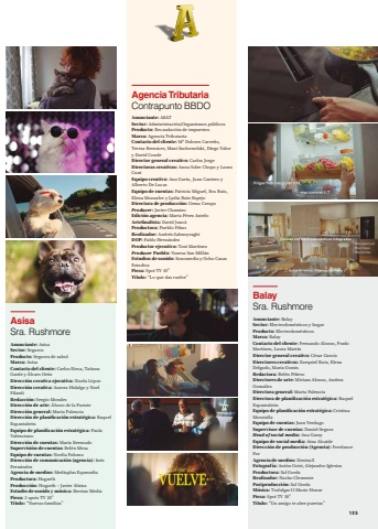 BalaySra. RushmoreAnunciante: BalaySector: Electrodomésticos y hogarProducto: ElectrodomésticosMarca: BalayContacto del cliente: Fernando Alonso, Prado Martínez, Laura MartínDirector general creativo: César GarcíaDirectores creativos: Ezequiel Ruiz, Elena Delgado, María GomisRedactora: Belén PiñeroDirectores de arte: Miriam Alonso, Andrea GonzálezDirectora general: Marta PalenciaDirectora de planificación estratégica: Raquel EspantaleónEquipo de planificación estratégica: Cristina MoratallaEquipo de cuentas: Juan VerdugoSupervisor de cuentas: Daniel SeguraHead of social media: Ana GarayEquipo de social media: Aina AlcaideDirección de producción (Agencia): Freelance ForAgencia de medios: DentsuXFotografía: Antón Goiri, Alejandro IglesiasProductora: Sal GordaRealizador: Nacho ClementePostproducción: Sal GordaMúsica: Trafalgar13 Music HousePieza: Spot TV 30”Título: “Un amigo te abre puertas”Agencia TributariaContrapunto BBDOAnunciante: AEATSector: Administración/Organismos públicosProducto: Recaudación de impuestosMarca: Agencia TributariaContacto del cliente: Mª Dolores Carreño, Teresa Bernácer, Maxi Suchowolski, Diego Valor y David CondeDirector general creativo: Carlos JorgeDirectoras creativas: Anna Soler Chopo y Laura CuniEquipo creativo: Ana Garín, Juan Cantero y Alberto De LucasEquipo de cuentas: Patricia Miguel, Eva Ruiz, Elena Monsalve y Lydia Ruiz-EspejoDirectora de producción: Gema CrespoProducer: Javier ChamizoEdición agencia: Marta Pérez AnteloArtefinalista: David JuncàProductora: Pueblo FilmsRealizador: Andrés SalmoyraghiDOP: Pablo HernándezProductor ejecutivo: Toni MartínezProducer Pueblo: Vanesa San MillánEstudios de sonido: Sonomedia y Ocho Casas EstudiosPieza: Spot TV 45”Título: “Lo que das vuelve”AsisaSra. RushmoreAnunciante: AsisaSector: SegurosProducto: Seguros de saludMarca: AsisaContacto del cliente: Carlos Eiroa, Tatiana Garde y Álvaro OrtizDirección creativa ejecutiva: Xisela LópezDirección creativa: Aurora Hidalgo y Noel FilardiRedacción: Sergio MoralesDirección de arte: Álvaro de la FuenteDirección general: Marta PalenciaDirección de planificación estratégica: Raquel EspantaleónEquipo de planificación estratégica: Paula ValencianoDirección de cuentas: María BermudoSupervisión de cuentas: Belén MesaEquipo de cuentas: Noelia PalomoDirección de comunicación (agencia): Inés FernándezAgencia de medios: Mediaplus EqumediaProductora: HogarthProducción: Hogarth – Javier AlsinaEstudio de sonido y música: Iberian MediaPieza: 2 spots TV 20”Título: “Nuevas familias”135