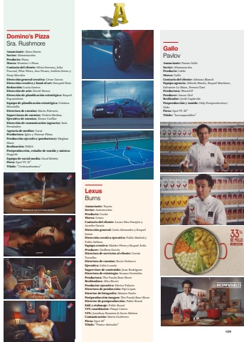 Domino’s PizzaSra. RushmoreAnunciante: Alsea IberiaSector: AlimentaciónProducto: PizzaMarca: Domino’s PizzaContacto del cliente: Silvia Serrano, Julia Pascual, Pilar Pérez, Ana Picazo, Andrea Serna y Dany MoralesDirección general creativa: César GarcíaDirección creativa y head of art: Ezequiel RuízRedacción: Lucía SantosDirección de arte: David MoreuDirección de planificación estratégica: Raquel EspantaleónEquipo de planificación estratégica: Cristina MoratallaDirectora de cuentas: Marta PalenciaSupervisora de cuentas: Violeta MedinaEjecutivo de cuentas: Álvaro CuéllarDirección de comunicación (agencia): Inés FernándezAgencia de medios: CaratProductora: Igloo y Finesse FilmsProducción ejecutiva (productora): Meghan ShawRealización: FAMAPostproducción, estudio de sonido y música:HogarthEquipo de social media: Good RebelsPieza: Spot TV 25”Título: “Croissantizzima”GalloPavlovAnunciante: Pastas GalloSector: AlimentaciónProducto: CaldoMarca: GalloContacto del cliente: Adriana BlanchEquipo agencia: Alfredo Binefa, Raquel Martínez, Salvatore La Mura, Ferran ClariProductora: WeareCPProducer: Arnau GiolRealizador: Jordi CapdevilaPosproducción y sonido: Only Postproduction / OídoPieza: Spot TV 20”Título: “Incomparables”LexusBurnsAnunciante: ToyotaSector: AutomociónProducto: CocheMarca: LexusContacto del cliente: Laura Díez Parajón y Aurelio GarcíaDirección general: Carla Alexander y Raquel SerónDirección creativa ejecutiva: Pablo Madrid y Pablo SalinasEquipo creativo: Maider Pérez y Raquel ÁvilaProducer: Guillem GarcíaDirectora de servicios al cliente: Carola TorralboDirectora de cuentas: Rocío DobarcoEjecutiva: Lidia LosadaSupervisor de contenido: Juan RodríguezDirectora de estrategia: Susana OuteiriñoProductora: The Panda Bear ShowRealizadora: Alba RicartProductor ejecutivo: Héctor PalacioDirectora de producción: Pipi LópezDirector de fotografía: Marino PardoPostproducción imagen: The Panda Bear ShowDirector de postproducción: Pablo BonalEdit y etalonaje: Pablo BonalVFX coordinator: Pimpi CastroVFX: Jonathan Ramírez & Sucio MotionComunicación: Marta GutiérrezPieza: Spot 40”Título: “Pintor distraído”139