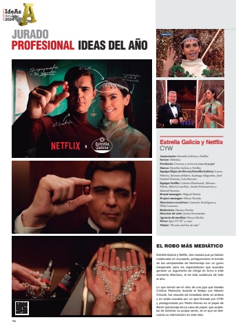 14XXVIII Anuncios nº 1727 28/04/2025 ideas del añoIDEAS DEL AÑOEL ROBO MÁS MEDIÁTICOEstrella Galicia y Netflix, dos marcas que ya habían colaborado en el pasado, protagonizaron el brindis de las campanadas de Nochevieja con un guion inesperado para los espectadores que buscaba generar un argumento de intriga en torno a este momento televisivo, el de más audiencia de todo el año. Lo que simuló ser el robo de una joya que llevaba Cristina Pedroche durante el festejo con Alberto Chicote, fue resuelto de inmediato tanto en antena y en redes sociales por un spot firmado por CYW y protagonizado por Pedro Alonso en el papel de Berlín (personaje de La casa de papel, que acababa de estrenar su propia serie), en el que se descubría su intervención en este robo.Estrella Galicia y NetflixCYWAnunciante: Estrella Galicia y NetflixSector: BebidasProducto: Cerveza y serie La casa de papelMarca: Estrella Galicia y NetflixEquipo Hijos de Rivera/Estrella Galicia: Laura Piñeiro, Ramón deMeer, Santiago Miguelez, José Gabriel Estrada, Lola BursónEquipo Netflix: Celeste Eberhardt, Silvana Piñón, Edorta Landeta, Ander Echezarreta y Manuel RománBrand manager: Miguel RemisProject manager: Elena PinedaDirectores creativos: Carmelo Rodríguez y Willy LomanaRedactora: Jimena DuránDirector de arte: Javier FernándezAgencia de medios: Havas MediaPieza: Spot TV 30” y casoTítulo: “El robo del fin de año”25