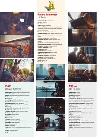 IDAEDarwin & VerneAnunciante: Instituto para la Diversificación y Ahorro EnergéticoSector: Administración/Organismos públicosProducto: Ahorro energéticoMarca: IDAEDirector general: Nacho HuidobroPresidente creativo: Carlos Sanz de AndinoDirector creativo: Pablo MendozaEquipo creativo: Tomás Cárdenas & Mikel BerasaluceResponsable de marca: Jorge Martín TeulónEjecutiva: Nora OrmaetxeaProducer agencia: Noelia Herrera CrespoProductora: BeSweetRealizador: Héctor HerceDOP: Alberto LeónEP: Lucía PérezProducer: Fabio FernándezJefe de producción: Dani HernándezMontador: Javier MartínezColor: Mario LlorenteSonido: José PlazaPieza: Spot TV 30”, cuñas radio, gráficas revista y exteriorTítulo: “Querida energía”Banco SantanderLaSantaAnunciante: Banco SantanderSector: FinanzasProducto: BancoMarca: Banco SantanderContacto del cliente: Marina Peña, Raúl García Just, Felipe Martín, Rosa González, Fernando García de Sola SanzDirector creativo: Álvaro GuzmánEquipo creativo: Nuria Martín, María Nistal, Juan Antonio Carrillo, Alberto Fernández, Ana AyusoDirector de cuentas: Rubén MateosEquipo de cuentas: Adrián Sánchez, Sete LinaresProducer: Luis Cristóbal (Freelance For)Responsable de medios: Yolanda MenéndezEquipo de medios: Marta RedondoAgencia de medios: CaratProductora: BlurRealizadora: Claudia LlosaAyudante de dirección: José CaleroDOP: Pancho AlcaineProductor ejecutivo: Pablo HerasProducer: Álvaro OlalquiagaPosproducción y sonido: SerenaPieza: Spot TV 30”Título:“Sin palabras”ElPozoRK PeopleAnunciante: ElPozoSector: AlimentaciónProducto: EmbutidoMarca: ElPozo ExtratiernosContacto del cliente: Pablo Olivares, Manuel Olano, Alfonso Rubio, Juan Carlos Cruz, Alicia Cánovas, Alberto Cabanes, Ofelia AlayónDirección creativa ejecutiva: Felipe RamosEquipo creativo: Ana Vences, Aida Campos, Ana Belén LópezDirección de cuentas: Laura Belloso, Alba GarcíaEjecutiva: Ana MuñozEquipo de social media: Sofía Martín, Cristina GarcíaProductora: Isola TVRealizador: Jiajei Yu YanDOP: Yousef DaoudProducción ejecutiva: Gonzalo BoronatProductor musical: Vicente Carrasco (ZipZap)Locutor: Cayo MartínPieza: Spot TV 1’30”Título: “Generación silenciada x Adopta Un Abuelo”140