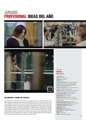 15IDEAS DEL AÑOXXVIII Anuncios2024IDEA DEL AÑOIberiaMcCannAnunciante: IAGSector: Turismo y viajesProducto: AerolíneaMarca: IberiaContacto del cliente: Gemma Juncá, Sophie Deslandes, Jesús de la Torre, Paula GaschGlobal creative partner, global brands:Emiliano González de PietriDirectores creativos: Ander Mendivil, David Valgañón, Guillermo SantaisabelEquipo creativo: Lucía Comba, Ricardo Rovira, Daya Muñoz, Ana Beneto, María de la FlorChief strategy officer: Lucas RodríguezStrategy director: María GoñiBusiness lead: Carmen MarfilEquipo de cuentas: Clara Mateos, Adrián Méndez, Marta Torrecillas, Mercedes Mínguez, Almudena RuizSocial media manager: María BaladoExecutive producer controller: María IglesiasProducción audiovisual: Carlos LucasAgencia de medios: Havas MediaProductora: JúpiterRealizador: Santiago ZannouPostproducción imagen y sonido: CraftMúsica: OEOPieza: Spot TV 180”Título: “El dilema de Navidad”NI NUEVA YORK NI TOKIOTe presentas en el aeropuerto de tu ciudad con un billete de vuelta a tu casa para disfrutar de las fiestas navideñas; te espera tu familia, a la que hace tiempo que no ves. Justo cuando vas a facturar tu equipaje, en el mostrador te ofrecen la oportunidad de cambiar ese vuelo por el destino que siempre habías soñado. Así comenzaba la campaña desarrollada por McCann para Iberia, El dilema de Navidad, donde a través de un experimento se seleccionaron a varios viajeros en Madrid y Lima (Perú) que ya tenían sus viajes planeados de vuelta a casa por Navidad, para ofrecerles la posibilidad de cambiar su vuelo sin coste alguno y con todo incluido al destino de sus sueños. Ellos pensaban que iban a formar parte de un documental de Iberia siendo sorprendidos con esta propuesta a la hora de embarcar en sus vuelos. Y mientras, se retransmitía en streaming captando cómo sus familias estaban viviendo el momento real de la decisión.26 15