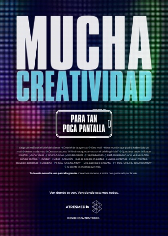 Llega un mail con el brief del cliente Debrief de la agencia Otro mail Una reunión que podría haber sido unmail Veinte mails más Otro con asunto “Al final nos quedamos con el briefing inicial” Quedarse tarde Buscar insights Tener ideas Tener LA IDEA OK del cliente Preproducción Cast, localización, arte, vestuario, foto, sonido, cámara ¿Graba? Listos ACCIÓN Eso se arregla en postpo Buena, cortamos Color, montaje, locución, grafismos Deadline “FINAL_ONLINE.MOV” A la agencia le encanta “FINAL_ONLINE_OKOKOK.MOV” Al cliente le encanta aún más.PARA TANPOCA PANTALLAVen donde te ven. Ven donde estamos todos.MUCHACREATIVIDADTodo esto necesita una pantalla grande. Y seamos sinceros, a todos nos gusta salir por la tele. CMYCMMYCYCMYKAF_CREATIVIDAD_REVISTA_ANUNCIOS_250X350.pdf 1 8/4/25 9:33