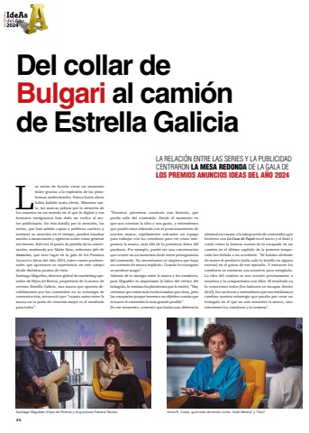 24XXVIII AnunciosLas series de ficción viven un momento dulce gracias a la explosión de las plataformas audiovisuales. Nunca hasta ahora había habido tanta oferta. Mientras tanto, las marcas pelean por la atención de los usuarios en un mundo en el que lo digital y sus formatos vertiginosos han dado un vuelco al sector publicitario. En esta batalla por la atención, las series, que han sabido captar a públicos cautivos y sostener su atención en el tiempo, pueden enseñar mucho a anunciantes y agencias sobre cómo generar ese interés. Este era el punto de partida de la conversación, moderada por Maite Sáez, redactora jefe de Anuncios, que tuvo lugar en la gala de los Premios Anuncios Ideas del Año 2024, entre cuatro profesionales que aportaron su experiencia en este campo desde distintos puntos de vista.Santiago Miguélez, director global de marketing operativo de Hijos de Rivera, propietaria de la marca de cerveza Estrella Galicia, una marca que apuesta decididamente por los contenidos en su estrategia de comunicación, reconoció que “cuanto antes entre la marca en la parte de creación mejor es el resultado para todos”.“Nosotros queremos construir una historia, que pueda salir del contenido. Desde el momento en que nos cuentan la idea y nos gusta, y entendemos que puede estar alineada con el posicionamiento de nuestra marca, rápidamente volcamos un equipo para trabajar con los creadores para ver cómo integramos la marca, más allá de la presencia física del producto. Por ejemplo, puede ser una conversación que ocurre en un momento dado entre protagonistas del contenido. No necesitamos ni siquiera que haya un contexto de marca explícito. Cuando lo consigues se produce magia”.Además de la sinergia entre la marca y los creadores, para Miguélez es importante la labor del vértice del triángulo, la ventana (la plataforma que lo emite). “Hay ventanas que están más evolucionadas que otras, pero las conquistas porque tenemos un objetivo común que es hacer el contenido lo más grande posible”.En ese momento, comentó que había una diferencia abismal en cuanto a la integración de contenidos que hicieron con La Casa de Papel en el inicio y al final y contó cómo la famosa escena de la escapada en un camión en el último capítulo de la primera temporada fue debida a un accidente. “Se habían olvidado de meter el producto [solía salir la botella en alguna escena] en el guion de ese episodio. Y entonces los creadores se sentaron con nosotros para arreglarlo. La idea del camión se nos ocurrió precisamente a nosotros y la compartimos con ellos. El resultado ya lo conocemos todos [los ladrones se escapan dentro de él], fue un boom y entendimos que necesitábamos cambiar nuestra estrategia que pasaba por crear un triángulo en el que no solo estuviese la marca, sino estuviesen los creadores y la ventana”.Santiago Miguélez (Hijos de Rivera) y la guionista Paloma Rando. Anna R. Costa, guionista de series como ‘Arde Madrid’ y ‘Fácil’.Del collar de Bulgari al camión de Estrella GaliciaLA RELACIÓN ENTRE LAS SERIES Y LA PUBLICIDAD CENTRARON LA MESA REDONDA DE LA GALA DE LOS PREMIOS ANUNCIOS IDEAS DEL AÑO 2024