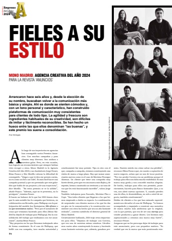 34A lo largo de sus trayectorias en agencias han conseguido varios Premios Anuncios. Con muchas campañas y para clientes muy diversos. Son asiduos a nuestras galas. Pero, en esta ocasión, han logrado un reconocimiento que siempre habían visto recoger a otros. Mono Madrid es la Agencia Creativa del Año 2024 y sus fundadores Jorge Fesser, Bitan Franco y Sito Morillo valoran la dificultad de conseguirlo. “Llegar a que te den ese premio cuesta, no es como un Sol o un CdeC. Es más fácil hacer una campaña puntual y que sea premiada que este galardón que habla de un proyecto y de una trayectoria”, dice Morillo. “En estos premios se ve la solidez”, añade Franco. “Además, aquí no te presentas, no lo persigues”, termina Fesser.Si hacen un balance de lo que fue 2024 tienen claro que lo más notable fue la campaña que hicieron, en colaboración con Revuelta, para Wallapop con la participación del modelo Jon Kortajarena (Me ofrezco o Lo que necesitamos nuevo). “Pero por el sumatorio de cosas que veníamos haciendo para ellos [Mono Madrid ha dejado de trabajar para Wallapop]. Era la consolidación del trabajo que realizamos con ese anunciante”, matiza Bitan Franco. “Hay proyectos en los que llevamos trabajando años de forma consistente. Es el caso de Wallapop, que brilló con esa campaña, tuvo mucha notoriedad y creativamente fue muy potente. Vips es otro con el que, campaña a campaña, estamos construyendo una visión de marca a largo plazo. Hay que sumar anunciantes nuevos como es el caso de Movistar Prosegur Alarmas. Un cliente que tiene una compañía muy fuerte detrás, pero que era una marca más flojita y, de repente, hemos construido un territorio y un tono de voz que les está funcionando increíble”, valora Jorge Fesser.También trabajaron para Facundo, Movistar Plus o Cope. “Son todos clientes que llegaron a los que hemos empezado a darles su espacio. La combinación de sorprender con clientes nuevos a los que les das un giro en la comunicación y la construcción consistente con otros ha hecho que sea un año bastante redondo”, contesta satisfecho el director general de Mono Madrid. Creativamente hablando, 2024 trajo retos importantes para ellos. “Dejamos de trabajar con Correos, que era una de nuestras minas creativas. Llevábamos cuatro años construyendo la marca y haciendo cosas bastante notorias que, además, ganaban premios. Nuestro miedo era cómo salvar esa pérdida”, reconoce Bitan Franco que, en cuanto a captación de nuevo negocio, aclara que no son de tocar puertas. “Por eso perder Correos era un problema porque el trabajo para ellos nos daba mucha visibilidad. Es una marca muy gorda y nos concedió muchas alegrías. De hecho, trabajar para ellos nos permitió, posteriormente, hacerlo para Banco Santander. Que, a su vez, nos abrió nuevas opciones. Y, cuando pierdes una de ellas, te desestabilizas, no solo a nivel de negocio, también creativamente”.Hablar de clientes a los que han mimado especialmente nos devuelve al caso de Wallapop. “Le hemos acompañado y empujado a construir una narrativa de marca mucho más ambiciosa que la original, con la que partían, que era de ser una startup para vender productos y ganar dinero. Les hicimos más aspiracionales y creamos una marca muy fuerte”, reconoce Fesser.Aseguran que no les preocupa dejar de trabajar para este anunciante, pero con pequeños matices. “Es verdad que era la marca que más posicionada estaTodos los integrantes del equipo de Mono MadridXXVIII Anuncios EmpresasArrancaron hace seis años y, desde la elección de su nombre, buscaban volver a la comunicación más básica y simple. Ahí es donde se sienten cómodos y, con un tono personal y característico, han construido plataformas de comunicación muy consistentes para clientes de todo tipo. La agilidad y frescura son ingredientes habituales de su creatividad, son difíciles de imitar y fácilmente reconocibles. Se han hecho un hueco entre las que ellos denominan “las buenas”, y este premio les suena a consolidación.Ana VenegasMONO MADRID, AGENCIA CREATIVA DEL AÑO 2024PARA LA REVISTA ‘ANUNCIOS’ FIELES A SU ESTILO