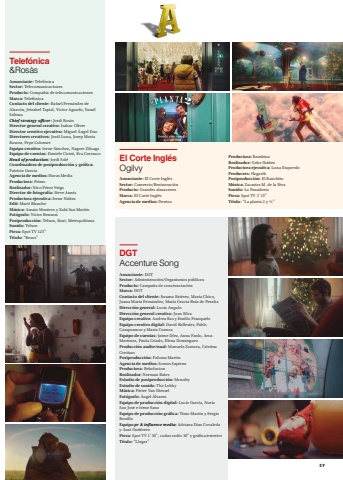 Telefónica&RosàsAnunciante: TelefónicaSector: TelecomunicacionesProducto: Compañía de telecomunicacionesMarca: TelefónicaContacto del cliente: Rafael Fernández de Alarcón, Jetzabel Tapial, Víctor Aguado, Yamil SalinasChief strategy officer: Jordi RosàsDirector general creativo: Isahac OliverDirector creativo ejecutivo: Miguel Ángel DuoDirectores creativos: Jordi Luna, Josep Maria Basora, Pepe ColomerEquipo creativo: Irene Sánchez, Nagore ZiluagaEquipo de cuentas: Daniele Cicini, Eva CarrascoHead of production: Jordi SoléCoordinadora de postproducción y gráfica:Patricia GarcíaAgencia de medios: Havas MediaProductora: PrimoRealizador: Nico Pérez VeigaDirector de fotografía: Steve AnnisProductora ejecutiva: Irene NúñezEdit: Martí BlancheMúsica: Amaia Montero y Xabi San MartínFotógrafo: Víctor BensusiPostproducción: Telson, Boat, MetropolitanaSonido: TelsonPieza: Spot TV 125”Título: “Besos”El Corte InglésOgilvyAnunciante: El Corte InglésSector: Comercio/RestauraciónProducto: Grandes almacenesMarca: El Corte InglésAgencia de medios: DentsuProductora: BambinaRealizador: Gabe IbáñezProductora ejecutiva: Luna EsquerdoProducers: HogarthPostproducción: El RanchitoMúsica: Zacarías M. de la RivaSonido: La PanaderíaPieza: Spot TV 3’15”Título: “La planta 2 y ½”DGTAccenture SongAnunciante: DGTSector: Administración/Organismos públicosProducto: Campaña de concienciaciónMarca: DGTContacto del cliente: Susana Estévez, María Chico, Juana María Fernández, María Gracia Ruiz de PeraltaDirección general: Lucía AnguloDirección general creativa: Juan SilvaEquipo creativo: Andrea Bas y Emilio FranqueloEquipo creativo digital: David Ballester, Pablo Campoamor y María CuencaEquipo de cuentas: Jaime Díez, Anna Fanlo, Aroa Martínez, Paula Criado, Elena DomínguezProducción audiovisual: Manuela Zamora, Cristina CortizasPostproducción: Paloma MartínAgencia de medios: Somos SapiensProductora: RebolucionRealizador: Norman BatesEstudio de postproducción: McnultyEstudio de sonido: The LobbyMúsica: Pieter Van DiesselFotógrafo: Ángel ÁlvarezEquipo de producción digital: Lucía García, Nuria San José e Irene SanzEquipo de producción gráfica: Timo Martín y Sergio BonillaEquipo pr & influence media: Adriana Díaz Covaleda y Auxi GutiérrezPieza: Spot TV 1’30”, cuñas radio 30” y gráfica/exteriorTítulo: “Llegar”37