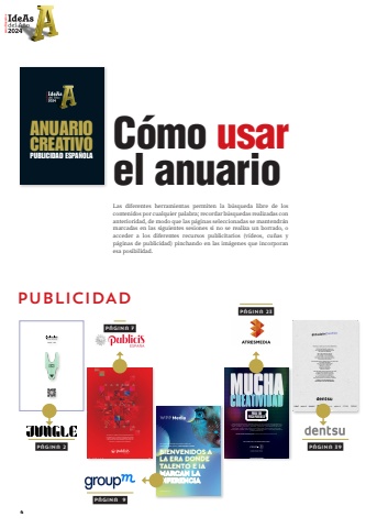 4PUBLICIDADANUARIOCREATIVOPUBLICIDAD ESPAÑOLA XXVIII AnunciosCómo usarel anuarioLas diferentes herramientas permiten la búsqueda libre de los contenidos por cualquier palabra; recordar búsquedas realizadas con anterioridad, de modo que las páginas seleccionadas se mantendrán marcadas en las siguientes sesiones si no se realiza un borrado, o acceder a los diferentes recursos publicitarios (vídeos, cuñas y páginas de publicidad) pinchando en las imágenes que incorporan esa posibilidad.4CMYCMMYCYCMYKAF 250X350 GRAFICA ANUNCIOS CAPITALISM.pdf 1 9/9/25 16:13Página 2CABEZAALMAMÚSCULOEn Publicis, creemos que las grandes ideas son el resultado de la perfecta armonía entre mente, cuerpo y espíritu. Por eso, trabajamos día a día para pensar de forma estratégica, ejecutar con precisión y conectar emocionalmente.Publicis_creatividad-revistapublicista_con bodycopy.indd 1 24/4/25 13:31Página 7CMYCMMYCYCMYKPágina 39Llega un mail con el brief del cliente Debrief de la agencia Otro mail Una reunión que podría haber sido unmail Veinte mails más Otro con asunto “Al final nos quedamos con el briefing inicial” Quedarse tarde Buscar insights Tener ideas Tener LA IDEA OK del cliente Preproducción Cast, localización, arte, vestuario, foto, sonido, cámara ¿Graba? Listos ACCIÓN Eso se arregla en postpo Buena, cortamos Color, montaje, locución, grafismos Deadline “FINAL_ONLINE.MOV” A la agencia le encanta “FINAL_ONLINE_OKOKOK.MOV” Al cliente le encanta aún más.PARA TANPOCA PANTALLAVen donde te ven. Ven donde estamos todos.MUCHACREATIVIDADTodo esto necesita una pantalla grande. Y seamos sinceros, a todos nos gusta salir por la tele. CMYCMMYCYCMYKAF_CREATIVIDAD_REVISTA_ANUNCIOS_250X350.pdf 1 8/4/25 9:33Página 23 En un mundo donde los medios están en todo y en todas partes, cada impacto cuentaBIENVENIDOS A LA ERA DONDE TALENTO E IABIENVENIDOS A LA ERA DONDE TALENTO E MARCAN LA DIFERENCIAwppmedia.comPágina 9 XXVIII Anuncios
