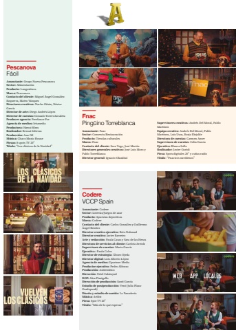 PescanovaFácilAnunciante: Grupo Nueva PescanovaSector: AlimentaciónProducto: LangostinosMarca: PescanovaContacto del cliente: Miguel Ángel González Ezquerra, Mateo VázquezDirectores creativos: Nacho Oñate, Néstor GarcíaDirector de arte: Diego Andrés LópezDirector de cuentas: Gonzalo Torres ZavaletaProducer agencia: Freelance ForAgencia de medios: IrismediaProductora: Hawai filmsRealizador: Bernat LliterasProducción: Ana GilMúsica: Chaco Music HousePiezas: 8 spots TV 20”Título: “Los clásicos de la Navidad”FnacPingüino TorreblancaAnunciante: FnacSector: Comercio/RestauraciónProducto: Tiendas culturalesMarca: FnacContacto del cliente: Sara Vega, José MartínDirectores generales creativos: José Luis Moro y Pablo TorreblancaDirector general: Ignacio OlazábalSupervisores creativos: Andrés Del Moral, Pablo MartínezEquipo creativo: Andrés Del Moral, Pablo Martínez, Luis Usoz, Borja ElejaldeDirectora de cuentas: Carmen AmerSupervisora de cuentas: Celia GarcíaEjecutiva: Blanca SollaRealizador: Javier GuridiPieza: Spots digitales 20” y cuñas radioTítulo: “Fnacicos navidenos”CodereVCCP SpainAnunciante: CodereSector: Loterías/Juegos de azarProducto: Apuestas deportivasMarca: CodereContacto del cliente: Carlos González y Guillermo Ángel BenitezDirector creativo ejecutivo: Beto NahmadDirector creativo: Javier BarreiroArte y redacción: Paula Casas y Sara de las HerasDirectora de servicios al cliente: Carlota ArriolsSupervisora de cuentas: Marta GarcíaEjecutiva : Paula CalvoDirector de estrategia: Álvaro OjedaDirector digital: Luis Alberto LópezAgencia de medios: Upartner MediaProductor ejecutivo: Pedro AlfonsoProducción: AntiestáticoDirección: Uriel CalatayudDOP: Alex PizzigalloDirección de producción: Santi GarcíaEstudio de postproducción: Veni (Julia PlazaGradepunk)Diseño y estudio de sonido: La PanaderíaMúsica: ArtlistPieza: Spot TV 20”Título: “Más de lo que esperas”41