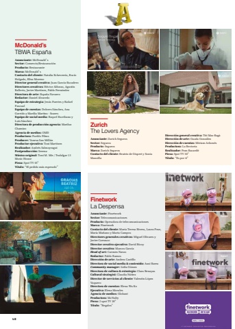 McDonald’sTBWA EspañaAnunciante: McDonald’sSector: Comercio/RestauraciónProducto: RestauranteMarca: McDonald’sContacto del cliente: Natalia Echeverría, Rocío Holgado, Elisa MorenoDirector general creativo: Juan García-EscuderoDirectores creativos: Héctor Alfonso, Agustín Ballerio, Javier Martínez, Pablo FernándezDirectora de arte: España NavarroRedactor: Daniel AlvaredoEquipo de estrategia: Jesús Fuertes y Rafael PascualEquipo de cuentas: Dolores Sánchez, Ana Garrido y Marilia Martins - SoaresEquipo de social media: Raquel Escribano y Luis SánchezDirectora de producción agencia: Mariluz ChamizoAgencia de medios: OMDProductora: Pueblo FilmsProducer: Vanesa San MillánProductor ejecutivo: Toni MartínezRealizador: Andrés SalmoyraguiPostproducción: SerenaMúsica original: Toni M. Mir / Trafalgar 13 Music HousePieza: Spot TV 45”Título: “El pedido más esperado”ZurichThe Lovers AgencyAnunciante: Zurich SegurosSector: SegurosProducto: SegurosMarca: Zurich SegurosContacto del cliente: Beatriz de Gispert y Sonia MansillaDirección general creativa: Titi Mas-BagàDirección de arte: Guada GonzálezDirección de cuentas: Miriam ArbonésProductora: La RectoriaRealizador: Fran BacarditPieza: Spot TV 30”Título: “Es por ti”FinetworkLa DespensaAnunciante: FinetworkSector: TelecomunicacionesProducto: Operadora de telecomunicacionesMarca: FinetworkContacto del cliente: María Teresa Rivera, Laura Pose, María Muñano y Marta CamposDirectores generales creativos: Miguel Olivares y Javier CarrascoDirector creativo ejecutivo: David RicoyDirector creativo: Marcos GarcíaHead of art: Carmen NavasRedactor: Pablo RamosDirección de arte: Andrea CastilloDirectora de social media & contenido: Auxi BareaCommunity manager: Lidia GómezDirectora de cultura & estrategia: Clara BenayasCultural strategist: Claudia NúñezDirector de servicios al cliente: Valentín López VaqueroDirectora de cuentas: Elena Wu KoEjecutiva: Elena MoralesAgencia de medios: GlobantProductora: McNultyPieza: 2 spot TV 20”Título: “Regalos”48