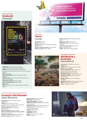 TwenixHumadAnunciante: TwenixSector: Cultura y ocioProducto: Plataforma de formación de inglésMarca: TwenixDirector creativo ejecutivo: Chema ArandaDirector creativo: Angelo DédaloEquipo creativo: Elena Castellón, Benjamín EspejoEquipo de cuentas: María OrenaIlustración: Bruno Lucas Martín, Elena CastellónDirector de producción: María OrenaPieza: Campaña exteriorTítulo: “Habla inglés hablando inglés”EmakundeDimensiónAnunciante: Instituto Vasco de la MujerSector: Administración/Organismos públicosProducto: Campaña de concienciación (25N. Día Internacional para la Eliminación de la Violencia contra las Mujeres)Marca: EmakundeContacto del cliente: Karmele Jaio Eiguren, Miren ElgarrestaEquipo creativo: Blanca Gómara, Ziortza Arnaiz, Paco Cabrera, David AltunaDirectora de cuentas: Ainhara ArriagaDirector de producción: Natxo EscobarPieza: MupisTítulo: “El porno es una escuela de violencia contra las mujeres”Fundación Vicki BernadetOgilvy BarcelonaAnunciante: Fundación Vicki BernadetSector: Ong’sProducto: Prevención, formación y sensibilización de los abusos sexuales infantilesMarca: Fundación Vicki BernadetContacto del cliente: Vicki Bernadet, Beatriz BarreraDirectora general: Gemma GutiérrezDirector creativo ejecutivo & strategy advisor:Gabriel García de OroDirectora creativa ejecutiva: Noelia FernándezDirección creativa: Enrique AlmodóvarDirección de arte: Laura GrandíoRedacción: Manuel MarcosDiseñadora gráfica: Yadira ReyesEquipo de contenido y social: Alba Cortiella, Lorena JiménezEquipo de cuentas: Alba Garlito, Giulia VischiComunicación: Christian Martínez, Laura Cuenca, Freya SentmartiLocutor: Willy GutiérrezProductora: OxígenoFotografía: Pep ÁvilaPieza: Spot TV 20”, radio y gráficasTítulo: “Cargando”SEO/BirdLife y EcoembesDarwin&VerneAnunciante: SEO/BirdLife y EcoembesSector: Ong’sProducto: Día Internacional de la PalabraMarca: Proyecto LIBERAContacto del cliente: Miriam Caba, Sara Güemes, Elena López y Nieves ReyDirector general: Alberto MartínezPresidente creativo: Carlos Sanz de AndinoDirectores creativos: Pablo Caraballo y Gonzalo CalvoEquipo creativo: Paco Reverte y Miguel CampillejoEquipo de cuentas: Ivet Honorato, Julia GarcíaPieza: Gráficas para medios digitalesTítulo: “Inteligencia natural”49