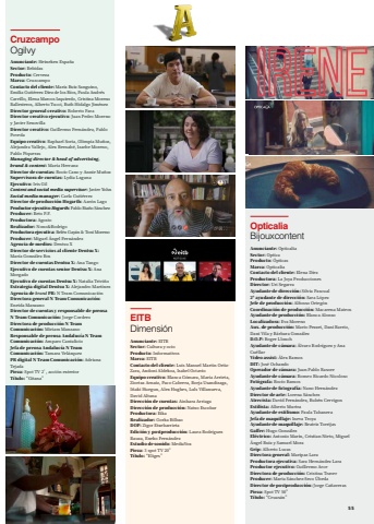 OpticaliaBijouxcontentAnunciante: OpticaliaSector: OpticaProducto: ÓpticasMarca: OpticaliaContacto del cliente: Elena DíezProductora: La Joya ProduccionesDirector: Uri SegarraAyudante de dirección: Silvia Pascual2ª ayudante de dirección: Sara LópezJefe de producción: Alfonso OrtegónCoordinación de producción: Macarena MateosAyudante de producción: Blanca AlonsoLocalizadora: Eva MorenoAux. de producción: Mario Pezzei, Dani Barrio, Dani Vila y Bárbara GonzálezD.O.P: Roger LlonchAyudante de cámara: Álvaro Rodríguez y Ana CuéllarVideo assist: Álex RamosDIT: José OchandoOperador de cámara: Juan Pablo RasoreAyudante de cámara: Romeo Ricardo NicolosoFotógrafa: Rocío RamosAyudante de fotografía: Nano HernándezDirector de arte: Lorena SánchezAtrecista: David Fernández, Rubén CervigonEstilista: Alberto MurtraAyudante de estilismo: Paula TabaneraJefa de maquillaje: Ineva TroyaAyudante de maquillaje: Beatriz TorrijasGaffer: Hugo GonzálezEléctrico: Antonio Marín, Cristian Nieto, Miguel Ángel Ruiz y Samuel MoraGrip: Alberto LucasDirectora general: Maripaz LaraProductora ejecutiva: Sara Hernández LaraProductor ejecutivo: Guillermo ArceDirectora de producción: Cristina TraverProducer: Marta Sánchez-Seco ÚbedaDirector de postproducción: Jorge CañaverasPieza: Spot TV 50”Título: “Cruasán”CruzcampoOgilvyAnunciante: Heineken EspañaSector: BebidasProducto: CervezaMarca: CruzcampoContacto del cliente: María Ruiz Sanguino, Emilia Gutiérrez Diez de los Ríos, Paula Andrés Carrillo, Elena Marcos Izquierdo, Cristina Moreno Ballesteros, Alberto Tucci, Ruth Hidalgo JiménezDirector general creativo: Roberto FaraDirector creativo ejecutivo: Juan Pedro Moreno y Javier SenovillaDirector creativo: Guillermo Fernández, Pablo PovedaEquipo creativo: Raphael Soria, Olimpia Muñoz, Alejandra Vallejo, Alex Bernabé, Izarbe Moreno, Pablo PiquerasManaging director & head of advertising, brand & content: María HerranzDirector de cuentas: Rocío Cano y Annie MuñozSupervisora de cuentas: Lydia LagunaEjecutivo: Iris GilContent and social media supervisor: Javier YohnSocial media manager: Carla GutiérrezDirector de producción Hogarth: Aarón LagoProductor ejecutivo Hogarth: Pablo Riaño SánchezProducer: Beto P.F.Productora: AgostoRealizador: Nono&RodrigoProductora ejecutiva: Belén Gayán & Toni MorenoProducer: Miguel Ángel FernándezAgencia de medios: Dentsu XDirector de servicios al cliente Dentsu X:María González RosDirector de cuentas Dentsu X: Ana TangoEjecutivo de cuentas senior Dentsu X: Ana MorgadoEjecutivo de cuentas Dentsu X: Natalia TriviñoEstrategia digital Dentsu X: Alejandro MartínezAgencia de brand PR: N Team ComunicaciónDirectora general N Team Comunicación:Eneida ManzanoDirector de cuentas y responsable de prensa N Team Comunicación: Jorge CorderoDirectora de producción N Team Comunicación: Miriam ManzanoResponsable de prensa Andalucía N Team Comunicación: Amparo CantalicioJefa de prensa Andalucía N Team Comunicación: Tamara VelázquezPR digital N Team Comunicación: Adriana TejadaPieza: Spot TV 2’, acción exteriorTítulo: “Gitana”EITBDimensiónAnunciante: EITBSector: Cultura y ocioProducto: InformativosMarca: EITBContacto del cliente: Luis Manuel Martin OrtizZara, Andoni Aldekoa, Isabel OctavioEquipo creativo: Blanca Gómara, María Arrieta, Ziortza Arnaiz, Paco Cabrera, Borja Usandizaga, Iñaki Huegun, Alex Hughes, Luls Villanueva, David AltunaDirección de cuentas: Ainhara ArriagaDirección de producción: Natxo EscobarProductora: EikaRealizador: Gorka BilbaoDOP: Zigor EtxebarrietaEdición y postproducción: Laura Rodríguez Bauza, Eneko FernándezEstudio de sonido: MediaVoxPieza: 3 spot TV 20”Título: “Eliges”55