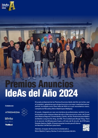 6Premios AnunciosIdeAs del Año 2024El jurado profesional de los Premios Anuncios IdeAs del Año (en la foto, casi al completo), galardones que otorga Anuncios a la mejor creatividad real española, ha elegido como Gran Idea de 2024 a Lo que necesitamos nuevo, campaña de Revuelta y Mono Madrid para Wallapop. El jurado, integrado por casi una treintena de profesionales, también ha seleccionado como mejores ideas del año a Este anuncio te cuida, de Ernest para Abanca Seguros; Comandante y Cartón, de Sra. Rushmore para Atlético de Madrid; Long live the King, de VML The Cocktail para Burger King; There is no second, de &Rosàs para Cupra, y El robo del fin de año, de CYW para Estrella Galicia y Netflix. El premio popular ha sido para El dilema de Navidad, de McCann para Iberia. Además, el equipo de Anuncios ha destacado aMono Madrid, Cupra y Dentsu X como empresas del año.Colaboran:XXVIII Anuncios