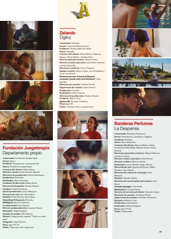 ZalandoOgilvyAnunciante: ZalandoSector: Comercio/RestauraciónProducto: Tienda online de modaMarca: ZalandoContacto del cliente: Silvia Pilloni , Bárbara Segura, Marta Maltez, Ariadna RuizDirector general creativo: Roberto FaraDirector creativo ejecutivo: Juan Pedro Moreno y Javier SenovillaDirectores creativos: Víctor VázquezEquipo creativo: Mateo López, Leo Fernández y Lucas ArredondoBusiness partner & head of lifestyle, consumer goods and entertainment: Clara SanchísDirectora de cuentas: Cristina EscalaSupervisora de cuentas: Nerea GarcíaProducción: CanadaRealizador: Arthur CouvatDirectora de producción: Christy AlcarazProducer: María VivesAgency PR: Enrique CaballeroPieza: Spot 30”Título: “Sentirte bien, te queda bien”Fundación JuegaterapiaDepartamento propioAnunciante: Fundación JuegaterapiaSector: Ong’sProducto: Campaña de concienciaciónMarca: Fundación JuegaterapiaContacto del cliente: Belén SoleraDirector creativo: José Antonio MadridDirectora de producción: Marisa RodríguezProductora: Sal GordaRealizador: Marc GonzálezAyudante de dirección: Mario PérezDirector de fotografía: Bernat SampolProducer: Rubén SubiratsJefe de producción: Javier BlázquezDirectora de arte: Bea AlmendrosEstilista: Paola Bosch y Rocío BayoMaquillaje/Peluquería: PeruchaMaking of: Ignacio GiménezLocalizaciones: Four RoomsDirector postproducción: Juanma GómezMontador: Ángel IngelmoEstudio de sonido: OEO MúsicaMúsica: Composición original “Todo va a salir bien”Fotógrafo: Ángel ÁlvarezPieza: Spot TV 60”Título: “Para que todo salga bien”Banderas PerfumesLa DespensaAnunciante: Banderas PerfumesSector: Perfumería, cosmética e higieneProducto: PerfumeMarca: Blue SeductionContacto del cliente: Blanca Muñiz, Julieta Fontanals, Pablo Rollé, Elianne Sastre, Sacha EstévezDirectores generales creativos: Miguel Olivares y Javier CarrascoDirector creativo ejecutivo: David RicoyDirector creativo: Marcos GarcíaRedactores: Lucía Martín, Sergio MacíasDirección de arte: Ignacio de Frutos, Mikel Sánchez, Jara DichasDirectora de cultura & estrategia: Clara BenayasPlanner: Claudia NúñezDirectora de social media and content: Auxi BareaContent manager: Ana SardáHead of art: Carmen NavasDirector de servicios al cliente: Valentín LópezDirectora de cuentas: Verónica GómezSupervisora de cuentas: Carolina ChamorroEjecutiva: Miriam CanoProductora: AntiestáticoRealizador: Willy RodríguezPieza: Spot TV 60”Título: “Seducción”61