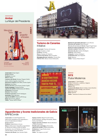Turismo de CanariasInitiativeAnunciante: Turismo de CanariasSector: Turismo y viajesProducto: TurismoMarca: Turismo de CanariasContacto del cliente: Elena GonzálezManaging director Initiative: Vicente RosCINO & CCO: Alfonso García-ValenzuelaBusiness & operations director: Lucía ÁlvarezDirectora de cuentas: María DusmetDirector de servicios al cliente: Miguel Ángel LópezHead of creative production: Enrique RodríguezDirector creativo: Pablo SforzaDirectora de arte: Cristina RodríguezRedactor: Pablo RufeteFotógrafo: Cristina RodríguezPostproducción: Juan SegundoPieza: ExteriorTítulo: “Canary Vision Project”AmbarLa Mujer del PresidenteAnunciante: Grupo AgoraSector: BebidasProducto: CervezaMarca: AmbarContacto del cliente: Enrique Torguet, Estela Gavin, Andrea Anguita, Laura SoroDirectores creativos: José Maza, Nacho CapeloRedactor: José MazaDirector de arte: Javier Vicent, Nacho CapeloProject manager: Natalia Da SilvaAgencia de medios: Mediterránea de MediosProductora: VessmediaDirector: Víctor SuñerProductor ejecutivo: José F. RodríguezIlustrador: Borja BonaqueAgencia de RRPP: Omnicom PR GroupPieza: Spot TV 30”, gráficasTítulo: “Ambar Hall of Flame”NYXPutos ModernosAnunciante: L’Oréal EspañaSector: Perfumería, cosmética e higieneProducto: CosméticaMarca: NYXContacto del cliente: Marta Cordero, Sonia SánchezRedactores: Pablo Pérdigo, Joan AlvaresArte: Inés AceroPieza: ExteriorTítulo: “Aumenta el volumen de tus labios”64Aguardientes y licores tradicionales de GaliciaBAP&CondeAnunciante: Consello Regulador das Indicacións Xeográficas das Augardentes e Licores Tradicionais de GaliciaSector: BebidasProducto: Aguardiente y licoresMarca: Indicaciones Geográficas Aguardiente de Hierbas de Galicia, Orujo de Galicia Envejecido, Licor de Hierbas de Galicia, Licor Café de Galicia y Orujo de GaliciaContacto del cliente: José Antonio FeijóoEquipo creativo: Miguel Conde-Lobato, Raquel Quintana, Rodrigo Fernández, Rubén García, José RubinaEquipo atención al cliente: Montse Martínez y Aldara FernándezPlanificación estratégica: Paula CoboAgencia de medios: BAP&Conde MediaProductora: Congo ProduccionesPieza: GráficasTítulo: “No tragues con todo”