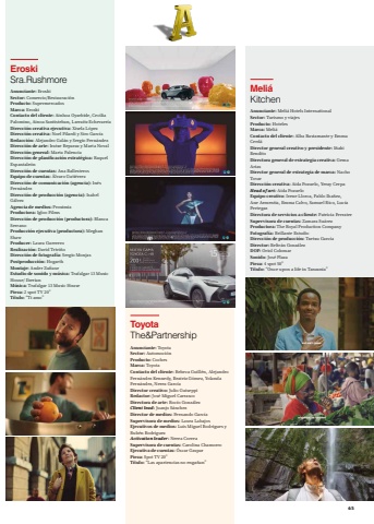 EroskiSra.RushmoreAnunciante: EroskiSector: Comercio/RestauraciónProducto: SupermercadosMarca: EroskiContacto del cliente: Ainhoa Oyarbide, Cecilia Palomino, Ainoa Santisteban, Larraitz EchevarríaDirección creativa ejecutiva: Xisela LópezDirección creativa: Noel Filardi y Siro GarcíaRedacción: Alejandro Galán y Sergio FernándezDirección de arte: Iratxe Reparaz y Marta NovalDirección general: Marta PalenciaDirección de planificación estratégica: Raquel EspantaleónDirección de cuentas: Ana BallesterosEquipo de cuentas: Álvaro GutiérrezDirección de comunicación (agencia): Inés FernándezDirección de producción (agencia): Isabel GálvezAgencia de medios: ProximiaProductora: Igloo FilmsDirección de producción (productora): Blanca SerranoProducción ejecutiva (productora): Meghan ShawProducer: Laura GuerreroRealización: David TriviñoDirección de fotografía: Sergio MonjasPostproducción: HogarthMontaje: Ander ZufiaurEstudio de sonido y música: Trafalgar 13 Music House/ IberianMúsica: Trafalgar 13 Music HousePieza: 2 spot TV 20”Título: “Ti amo”ToyotaThe&PartnershipAnunciante: ToyotaSector: AutomociónProducto: CochesMarca: ToyotaContacto del cliente: Rebeca Guillén, Alejandro Fernández Kennedy, Beatriz Gómez, Yolanda Fernández, Nerea GarcíaDirector creativo: Julio GuiseppiRedactor: José Miguel CarrascoDirectora de arte: Rocío GonzálezClient lead: Juanjo SánchezDirector de medios: Fernando GarcíaSupervisora de medios: Laura LabajosEjecutivos de medios: Luis Miguel Rodrigues y Rubén RodríguezActivation leader: Nerea CorreaSupervisora de cuentas: Carolina ChamorroEjecutiva de cuentas: Óscar GasparPieza: Spot TV 20”Título: “Las apariencias no engañan”MeliáKitchenAnunciante: Meliá Hotels InternationalSector: Turismo y viajesProducto: HotelesMarca: MeliáContacto del cliente: Alba Bustamante y Emma CerdáDirector general creativo y presidente: Iñaki BenditoDirectora general de estrategia creativa: Gema AriasDirector general de estrategia de marca: Nacho TovarDirección creativa: Aida Pozuelo, Yeray CerpaHead of art: Aida PozueloEquipo creativo: Irene Llorca, Pablo Ibañez, Ane Armentia, Emma Calvo, Samuel Rico, Lucía PertegazDirectora de servicios a cliente: Patricia FerraterSupervisora de cuentas: Zamara SuárezProductora: The Royal Production CompanyFotografía: Brillante EstudioDirección de producción: Txetxu GarcíaDirector: Beltrán GonzálezDOP: Oriol ColomarSonido: José PlazaPieza: 4 spot 50”Título: “Once upon a life in Tanzania”65