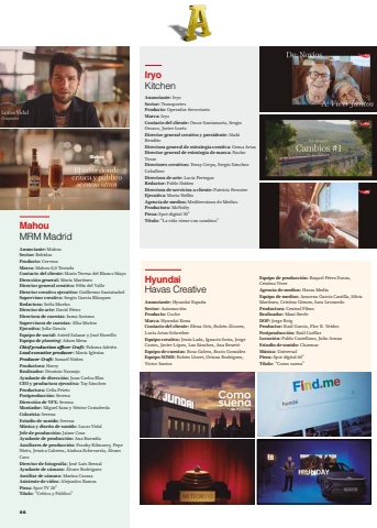 MahouMRM MadridAnunciante: MahouSector: BebidasProducto: CervezaMarca: Mahou 0,0 TostadaContacto del cliente: María Teresa del Blanco MayoDirección general: María MartínezDirector general creativo: Félix del ValleDirector creativo ejecutivo: Guillermo SantaisabelSupervisor creativo: Sergio García BlázquezRedactora: Sofía MuelasDirector de arte: David PérezDirectora de cuentas: Inma SorianoSupervisora de cuentas: Alba MuñozEjecutiva: Julia GarcíaEquipo de social: Astrid Salazar y José HorrilloEquipo de planning: Adam MesaChief production officer Craft: Paloma AdriénLead executive producer: María IglesiasProducer Craft: Ismael NúñezProductora: HarryRealizador: Dionisio NaranjoAyudante de dirección: Juan Carlos BlasCEO y productora ejecutiva: Tay SánchezProductora: Celia PrietoPostproducción: SerenaDirección de VFX: SerenaMontador: Miguel Sanz y Néstor CostafredaColorista: SerenaEstudio de sonido: SerenaMúsica y diseño de sonido: Lucas VidalJefe de producción: Jaime CruzAyudante de producción: Ana BuendíaAuxiliares de producción: Franky Kilmurry, Pepe Nieto, Jessica Cabrera, Ainhoa Echevarría, Álvaro CaroDirector de fotografía: José Luis BernalAyudante de cámara: Álvaro RodríguezAuxiliar de cámara: Marina CarasaAsistente de vídeo: Alejandro RamosPieza: Spot TV 20”Título: “Crítica y Público”HyundaiHavas CreativeAnunciante: Hyundai EspañaSector: AutomociónProducto: CocheMarca: Hyundai KonaContacto del cliente: Elena Gris, Rubén Álvarez, Lucía Arias-SchreiberEquipo creativo: Jesús Lada, Ignacio Soria, Jorge Castro, Javier López, Luz Sánchez, Ana BenetóEquipo de cuentas: Rosa Galera, Rocío GonzálezEquipo SOME: Rubén Lloret, Oriana Rodríguez, Víctor SantosEquipo de producción: Raquel Pérez Navas, Cristina ViverAgencia de medios: Havas MediaEquipo de medios: Azucena García Castilla, Silvia Martínez, Cristina Gómez, Sara LeonardoProductora: Central FilmsRealizador: Maxi SterleDOP: Jorge RoigProductor: Raúl García, Flor R. VeidezPostproducción: Raúl CuéllarLocución: Pablo Castellano, Julio ArnauEstudio de sonido: CharmacMúsica: UniversalPieza: Spot digital 60”Título: “Como suena”IryoKitchenAnunciante: IryoSector: TransportesProducto: Operador ferroviarioMarca: IryoContacto del cliente: Oscar Santamaria, Sergio Orozco, Javier LorésDirector general creativo y presidente: Iñaki BenditoDirectora general de estrategia creativa: Gema AriasDirector general de estrategia de marca: Nacho TovarDirectores creativos: Yeray Cerpa, Sergio Sánchez CaballeroDirectora de arte: Lucía PertegazRedactor: Pablo IbáñezDirectora de servicios a cliente: Patricia FerraterEjecutiva: Marta HellínAgencia de medios: Mediterránea de MediosProductora: McNultyPieza: Spot digital 50”Título: “La vida viene con cambios”66