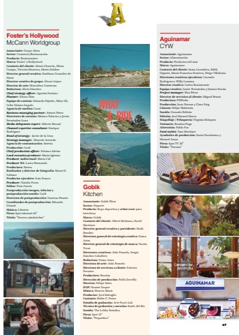 GobikKitchenAnunciante: Gobik WearSector: DeporteProducto: Ropa deportiva y urban wear para bicicletasMarca: GobikContacto del cliente: Albert Medrano, David MartínezDirector general creativo y presidente: Iñaki BenditoDirectora general de estrategia creativa: Gema AriasDirector general de estrategia de marca: Nacho TovarDirectores creativos: Aida Pozuelo, Sergio Sánchez CaballeroRedactora: Gema AriasDirectora de arte: Aida PozueloDirectora de servicios a cliente: Patricia FerraterProductora: BosalayDirección de producción: Pablo ZorrillaDirector: Felipe SalasDOP: Nauzet GasparMúsica: Heaven MusicProductor: José BattaglioCantante: Belén G. PereaEstudio de grabación: Arte Facto LabTécnico de grabación y mezclas: Kaelo del RíoSonido: The Lobby EstudiosPieza: Spot 42”Título: “Pequeñica”AguinamarCYWAnunciante: AguinamarSector: AlimentaciónProducto: Productos del marMarca: AguinamarContacto del cliente: Inma Larrañeta, Edith Giganto, María Francisca Fontova, Diego VillabonaDirectores creativos ejecutivos: Carmelo Rodríguez y Willy LomanaDirector creativo: Carlos BustamanteEquipo creativo: Javier Fernández y Jimena DuránProject manager: Elsa PérezDirector de servicios al cliente: Miguel RemisProductora: PSWorksProducción: Juan Navaza y Clara PuigCámara: Felipe MalatestaSonido: Gonzalo BeltránEdición: José Manuel SierraMaquillaje / Peluquería: Virginia MárquezVestuario: Romina PugaAttrezzista: Pablo PazFood stylist: Yazz MartínezAyudantes de producción: Sonia Norabuena y Manuel ArayaPieza: Spot TV 20”Título:“Terraza”Foster’s HollywoodMcCann WorldgroupAnunciante: Grupo AlseaSector: Comercio/RestauraciónProducto: RestaurantesMarca: Foster’s HollywoodContacto del cliente: Alexis Chauvin, Elena Campo, Victoria Montoro, Marta SolabreDirector general creativo: Emiliano González de PietriDirector creativo de grupo: Álvaro LópezDirector de arte: Marcelino ContrerasRedactora: Alicia SánchezChief strategy officer: Agustín SorianoPlanner: Álvaro DiezEquipo de cuentas: Eduardo Pajuelo, Mery Gil, Celia Gómez-AnguloAgencia de medios: CaratBusiness managing partner: Atenea PérezDirectores de cuentas: Mónica Palacios y Javier Fernández-LunaMedia delopment expert: Alberto BernalChannel expertise consultant: Enrique RodríguezHead of strategy: Javier de la CruzStrategy manager: Marcela AcevedoAgencia de comunicación: AtreviaProducción: CraftChief production officer: Paloma AdrienLead executive producer: María IglesiasProducer audiovisual: Marta CidProducer BA: Laura HernandoProductora: ZissouRealizador y director de fotografía: Mauri D. GalianoProductor ejecutivo: Iván FrancoProducer: Natalia PurasEditor: Fran GarcíaPostproducción imagen, telecine y postproducción sonido: CraftDirectora de postproducción: Vanessa PizarroCoordinador de postproducción: Eduardo UriarteMúsica: LibreríaPieza: Spot internet 60”Título: “Nuevos sándwiches”67