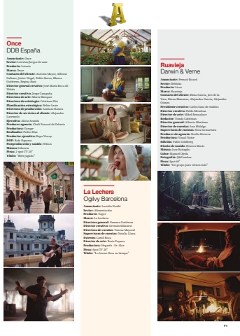 RuaviejaDarwin & VerneAnunciante: Pernod RicardSector: BebidasProducto: LicorMarca: RuaviejaContacto del cliente: Elma García, Javi de la Vara, Diana Manzano, Alejandro García, Alejandro GómezPresidente creativo: Carlos Sanz de AndinoDirector creativo: Pablo MendozaDirector de arte: Mikel BerasaluceRedactor: Tomás CárdenasDirector general: Alberto MartínezDirector de cuentas: Ana HidalgoSupervisora de cuentas: Nora OrmaetxeaProducer de agencia: Noelia HerreraProductora: Visual NoiseEdición: Pablo GoldbergDiseño de sonido: Heaven MusicMúsica: Jose BattaglioColor: Manuel OjedaFotografía: Q&CumberPieza: Spot 60”Título: “Un grupo para vernos más”La LecheraOgilvy BarcelonaAnunciante: Lactalis NestléSector: AlimentaciónProducto: YogurMarca: La LecheraDirectora general: Gemma GutiérrezDirector creativo: Germán MilanesiDirectora de cuentas: Vanesa MayoralSupervisora de cuentas: Natalia LlanaExterno: Camil RocaDirector de arte: Boris PuyanaProductora: Hogarth - Sr. AlcePieza: Spot TV 20”Título: “Lo bueno lleva su tiempo”OnceDDB EspañaAnunciante: OnceSector: Loterías/Juegos de azarProducto: LoteríaMarca: OnceContacto del cliente: Antonio Mayor, Alfonso Galiano, Javier Nogal, Pablo Sierra, Blanca Gutiérrez, Regina RuizDirector general creativo: José María Roca de ViñalsDirector creativo: Jorge CampañaDirectora de arte: Marta MárquezDirectora de estrategia: Cristiana ZitoPlanificación estratégica: Belén LesteDirectora de producción: Azahara RamosDirector de servicios al cliente: Alejandro LavezzoloEjecutiva: Alicia ArandaProducer agencia: Cheli Pascual de ZuluetaProductora: GarageRealizador: Pedro DíazProductor ejecutivo: Kepa VizcayDOP: Rafa RaparazPostproducción y sonido: TelsonMúsica: LibreríaPieza: 2 spot TV 20”Título: “Bien jugado”71