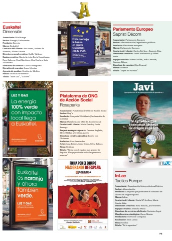 Parlamento EuropeoSapristi DécomAnunciante: Parlamento EuropeoSector: Administración/Organismos públicosProducto: Elecciones europeasMarca: Parlamento EuropeoContacto del cliente: Carlos Rul·lan y Eugenio DíazDirectores creativos: David Adelantado y Alfred PavíaEquipo creativo: Marta Guillén, Inés Carnicer, Carmen RiberaDirectora de cuentas: Olga PascualPiezas: ExteriorTítulo:“Leyes no escritas”EuskaltelDimensiónAnunciante: MásOrangeSector: Energía/CarburantesProducto: EnergíaMarca: EuskaltelContacto del cliente: Ana torres, Andrea de Naverán, Eloien UriarteDirector general creativo: Guille ViglioneEquipo creativo: María Arrieta, Borja Usandizaga, Paco Cabrera, Unai Martínez, Alex Hughes, Luis VillanuevaDirectora de cuentas: Laura AristeguietaEjecutiva de cuentas: Joane IglesiasAgencia de medios: Gestión de MediosPiezas: Gráficas de exteriorTítulo: “Mari Luz”, “Colores”Plataforma de ONG de Acción SocialRosaparksAnunciante: Plataforma de ONG de Acción SocialSector: Ong’sProducto: Campaña X Solidaria (Declaración de la renta)Marca: Plataforma de ONG de Acción SocialContacto del cliente: Marta García y Lucía BerrugaProject managers agencia: Gemma Anglada, Mercè Millan y Cristina AsoreyDirectora creativa ejecutiva: Loreto von ChrismarRedactor: Nico FernándezArtes: Lina Robles, Irene Guim, Silvia TaboasPieza: Gráficas Título:“Ficha por el equipo más grande de España. El equipo donde todas las personas marcan”InLacTactics EuropeAnunciante: Organización Interprofesional LácteaSector: AlimentaciónProducto: Campaña que promueve el consumo de lácteos de origen españolMarca: InLacContacto del cliente: Nuria Mª Arribas, María García AdánDirectores creativos: Rosa Rincón, José FuentesEquipo creativo: Arancha PradaDirectora de servicios al cliente: Verónica SeguiPlanificación estratégica: Óscar MozúnProductora: The Good CompanyRealizador: Ibon LandaPieza: GráficaTítulo: “Te lo agradece”75