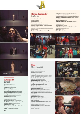Artículo 14ErnestAnunciante: Artículo 14Sector: Cultura y ocioProducto: Periódico onlineMarca: Artículo 14Director general: Abelardo BethencourtDirector creativo general: Nacho GuillóSupervisora de marcas: Noelia DapenaHead of social & e-commerce: Borja López-GómezSocial media executive: Paula AndrésHead of art: Nacho GómezDirectora de arte: Inés CriadoProductora: La RemediosRealizador/Productor: Israel MedranoHead of live experiences: Marta García ViudesEvents producer: Fernanda CanutoEdición: Blanca AgudoDirector de fotografía: Manuel Zafra TurónPieza: Spot 2’Título: “La danza de la igualdad”VipsMono MadridAnunciante: Grupo AlseaSector: Comercio/RestauraciónProducto: RestaurantesMarca: VipsContacto del cliente: Sandra Carrasco, Raquel Martín, Sara Muñoz, Raquel Sesmero, Lautaro Sánchez, Sara Pérez, Borja CameronCCO: Sito Morillo, Bitan FrancoManaging director: Jorge FesserDirector creativo: Jordi Romans, René MaconeEquipo creativo: Irene San JoséDirectora de cuentas: María CasadoProducer: Chapi CalvoPlanificación estratégica: Adrián MediavillaAgencia de medios: CaratBusiness manager partner: Atenea PérezPlanificación estratégica: Javier de la CruzÁrea cuentas: Mónica Palacios, Alberto Bernal, Lorena JuárezProductora: RomaRealizadora: Claudia BarralProductor ejecutivo: Pablo García AconProducer: Carlos MartínDOP: Andy PulidoDirectora de postproducción: Tamara Díaz LarumbeMúsica original: Chaco MusicEstudio de sonido: Estudios La PanaderíaPieza: Spot TV 50”Título: “Homenaje”Banco SantanderLaSantaAnunciante: Banco SantanderSector: FinanzasProducto: BancoMarca: Banco SantanderDirectora de marketing: Marina PeñaDirector creativo LaSanta, Banco Santander:Álvaro GuzmánDirector de cuentas LaSanta, Banco Santander:Rubén MateosEquipo creativo LaSanta y de marca Banco Santander: Juan Antonio Carrillo, Ana Becerra, Jose María Cornejo, María Nistal, Ana Ayuso, Fernando Galindo, Alberto Fernández, Marta MarínDirector y responsable de medios: Felipe Martín y Yolanda MenéndezAgencia de medios: CaratManaging director de Carat Madrid: Antonio ArizónProductora: RomaRealizador: Félix BollaínPostproducción imagen y sonido: Serena VideoComposición musical: AitanaPieza: Spot TV 30”Título: “Bienestando”76