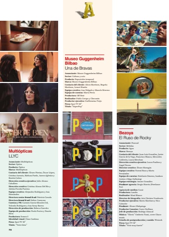 Museo Guggenheim BilbaoUna de BravasAnunciante: Museo Guggenheim BilbaoSector: Cultura y ocioProducto: Exposición temporalMarca: Museo Guggenheim BilbaoContacto del cliente: Alicia Martínez, Begoña Martínez, Lezuri EtxeitaEquipo creativo: Ana Delgado y Manolo MorenoEquipo de cuentas: María PereaProductora: Off BeatRealizador: Pablo Crespo y ChecuninProductor ejecutivo: Guillermina TrejoPieza: Spot TV 20”Título: “SúperPop”MultiópticasLLYCAnunciante: MultiópticasSector: OpticaProducto: ÓpticaMarca: MultiópticasContacto del cliente: Álvaro Fiestas, Óscar López, Cristina Asensio, Bárbara Pardo, Aurora Iglesias y Beatriz CaleroDirección creativa ejecutiva: Julio Alonso CaballeroDirección creativa: Cristina Alonso Del Río y Adrián Poveda PuertasEquipo creativo: Alejandra Rodríguez y Ana HernándezDirectora senior brand & ad: Patricia CavadaDirectora brand & ad: Esther CarmonaCuentas y PR: Carmen García-Morales Cid, Yolanda Rodríguez y Ana Saray BarrosDirección de producción: Rebeca GarroboEquipo de producción: Paula Frutos y Duarte EirosProductora: Somos 5Identidad visual: Clara CardonaPieza: Spot TV 50”Título: “Verte bien”BezoyaEl Ruso de RockyAnunciante: PascualSector: BebidasProducto: AguaMarca: BezoyaContacto del cliente: Juan Luis González, Javier García de la Vega, Francisco Blanco, Mercedes Calderón, Laura MerchanDirección creativa ejecutiva: Lucas Paulino y Ángel TorresDirector creativo: Álvaro MarugánEquipo creativo: Noemí Ruoz y Marta FernándezEquipo de cuentas: Estefanía Gimeno, Izaskun Arrien e Iñigo GallastegiEquipo estrategia: Amaro GonzálezProducer agencia: Sergio Huerta (Freelance For)Agencia de medios: CaratProductora: LandiaRealizador: Maxi BlancoDirector de fotografía: Aris Christos VoudourisProductor ejecutivo: Marta Martínez y Nico CabucheProducer: Álvaro OlalquiagaProductor Canarias: Curro OrellanaJefe de producción: Rodrigo AbascalMúsica: “Gloria” Umberto Tozzi, cover Chaco musicEstudio de postproducción y sonido: WeworkPieza: Spot TV 30”Título: “Vivir muy fuerte”78